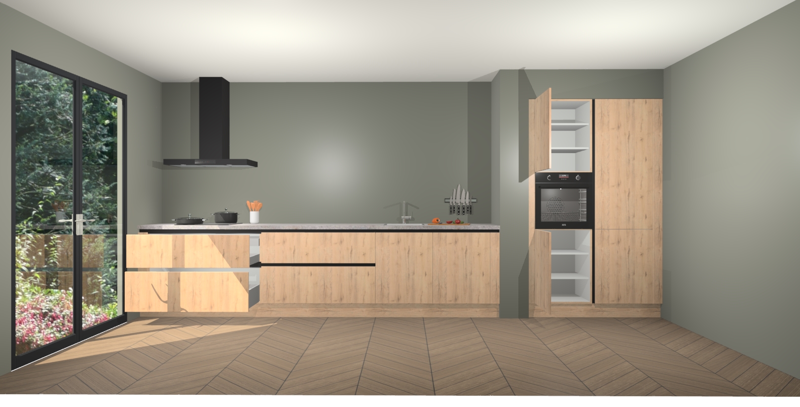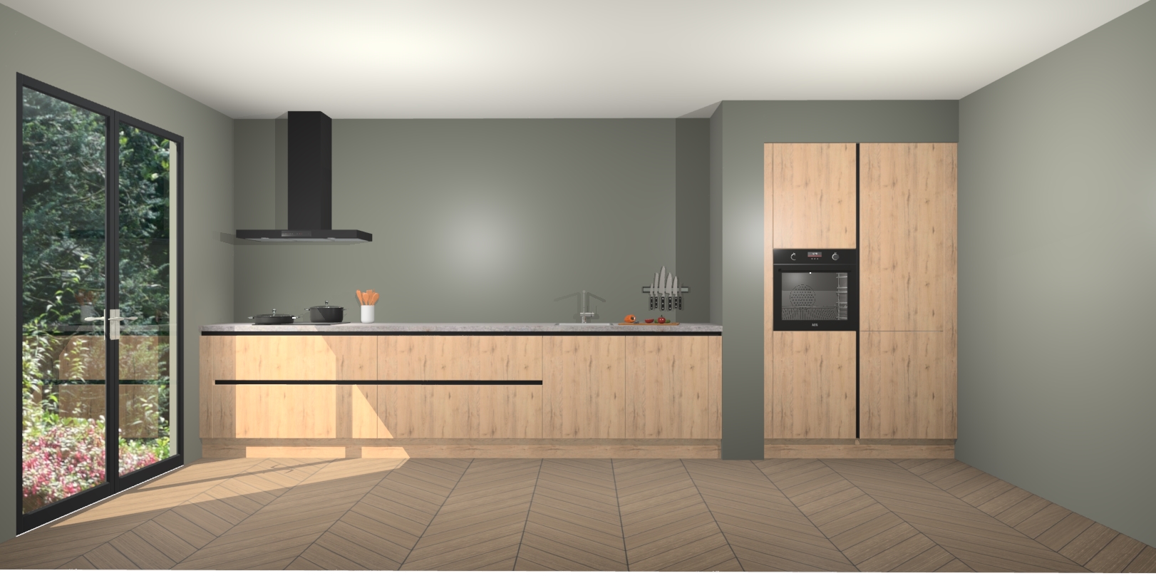 Met de Madera Natuur greeploze keuken Calgary Maakt u van uw keuken het pronkstuk van uw huis. Stijlvol en toch praktisch, de nieuwste look voor wie meer waarde en charme aan zijn huis wil toevoegen. Met prachtige handgrepen die zich lenen voor een klassieke stijlbron, zal u niet teleurgesteld zijn in het resultaat. De soft-close deurscharnieren geven een gevoel van luxe omdat ze zachtjes bewegen zonder storende of krakende geluiden te veroorzaken.