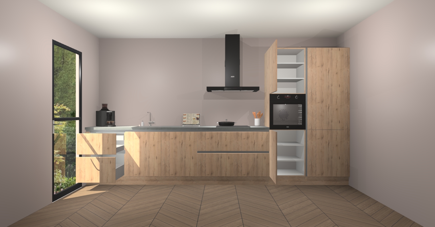 De Madera Natuur greeploze keuken Leuven is de perfecte mix van modern en tijdloos design. Met zijn prachtige glazen deuren op de bovenkastjes voegt hij echt iets speciaals en unieks toe aan elke keuken. En met vijf ingebouwde apparaten inbegrepen - een oven, inductiekookplaat, afzuigkap, vaatwasser en koelkast - kunt u deze keuken echt helemaal van uzelf maken! U kunt na bestelling ook upgraden naar AEG voor een nog hogere kwaliteitservaring.
