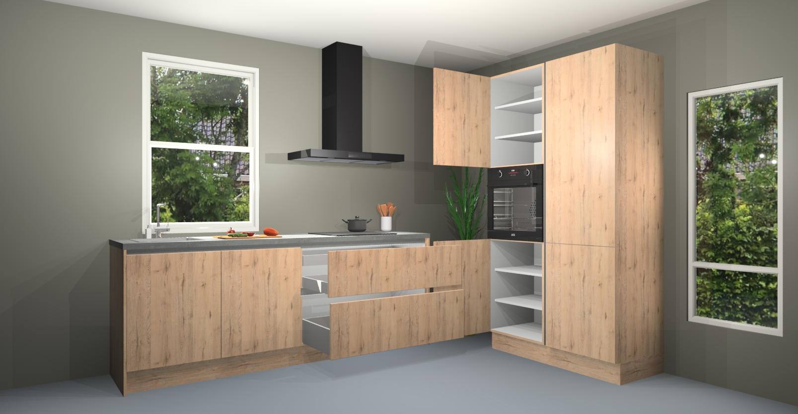 Ervaar het ultieme gevoel van warmte en gezelligheid in uw huis met de luxe Madera natuur greeploze keuken Monaco! Deze ongelooflijk sfeervolle houtlook straalt heerlijke warmte uit en tovert elke keuken om tot een gezellig familiecentrum. Breng uw dromen tot leven met deze unieke keuken, ontworpen voor moeiteloze luxe en functionaliteit.