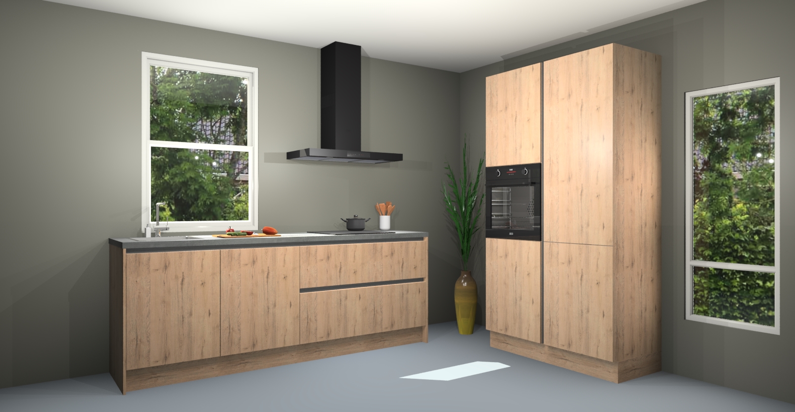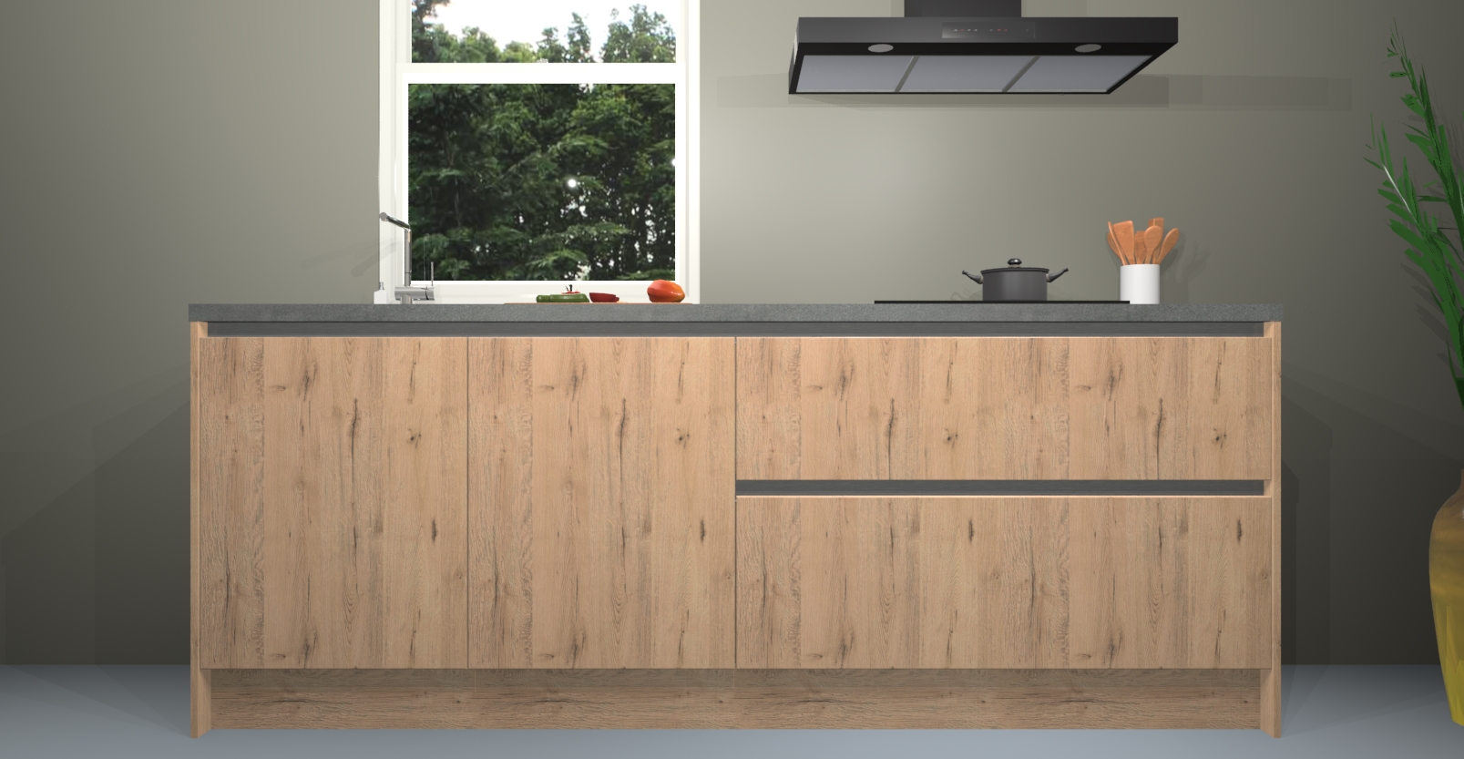 De Madera natuur greeploze keuken Monaco heeft voldoende opbergruimte om uw keukenbenodigdheden georganiseerd en netjes te houden. Geniet van het gemak van de soft-close deuren, die deze stijlvolle look perfect afmaken. Maar dat is nog niet alles. Met de Madera natuur greeploze keuken Monaco krijgt u maar liefst 5 ingebouwde apparaten: een oven, inductiekookplaat, afzuigkap, vaatwasser en koelkast. Deze kunnen gemakkelijk worden geüpgraded naar AEG als ze besteld zijn.