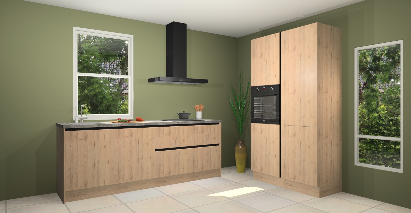 Ervaar het ultieme gevoel van warmte en gezelligheid in uw huis met de luxe Madera natuur greeploze keuken Monaco! Deze ongelooflijk sfeervolle houtlook straalt heerlijke warmte uit en tovert elke keuken om tot een gezellig familiecentrum. Breng uw dromen tot leven met deze unieke keuken, ontworpen voor moeiteloze luxe en functionaliteit.