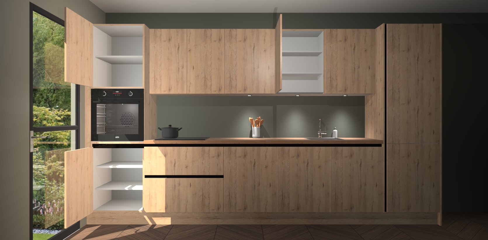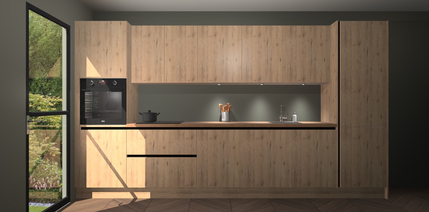 Dit is de perfecte keuken voor wie op zoek is naar een luxueuze stijl zonder zijn portemonnee te legen! Het chique ontwerp van de madera natuur greeploze keuken Wels voegt dat vleugje verfijning toe aan elk huis. Het gemak van voorgemonteerde kasten bespaart u talloze uren tijd en energie, zodat u veel sneller dan verwacht kunt beginnen te genieten van uw prachtige nieuwe keuken. Bovendien bedraagt de levertijd slechts 7 weken.
