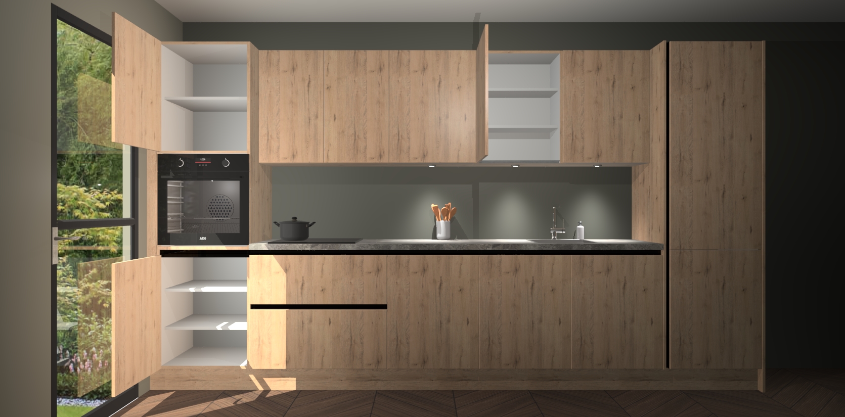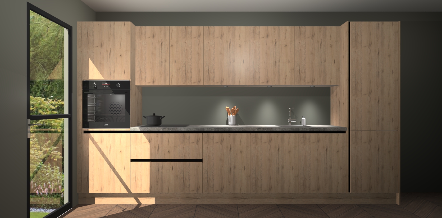 Dit is de perfecte keuken voor wie op zoek is naar een luxueuze stijl zonder zijn portemonnee te legen! Het chique ontwerp van de madera natuur greeploze keuken Wels voegt dat vleugje verfijning toe aan elk huis. Het gemak van voorgemonteerde kasten bespaart u talloze uren tijd en energie, zodat u veel sneller dan verwacht kunt beginnen te genieten van uw prachtige nieuwe keuken. Bovendien bedraagt de levertijd slechts 7 weken.