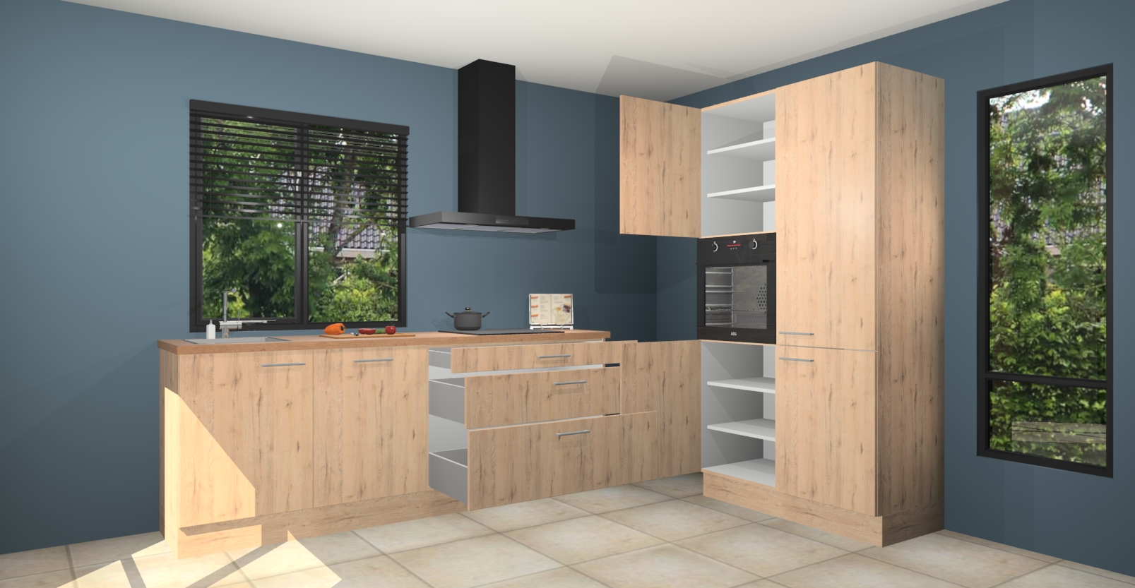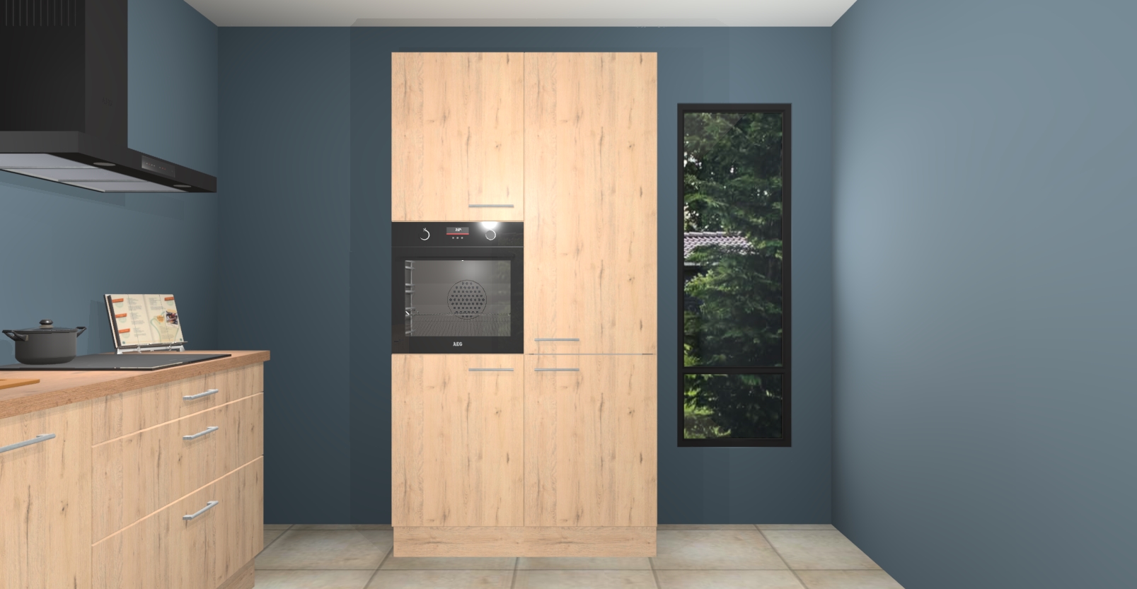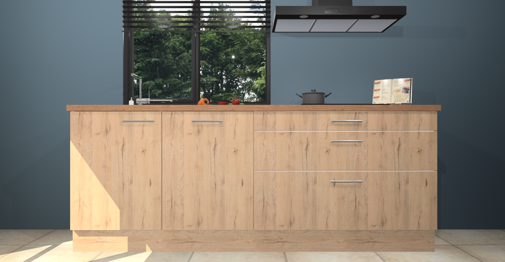 De setting is compleet gemaakt door de vijf inbouwapparaten: wanneer u gaat bestellen kunt u upgraden naar AEG-apparaten als oven, inductieplaat, afzuigkap, vaatwasser en koelkast. Kiest u voor onze Madera natuur keuken Monaco, dan weet u zeker dat u te maken heeft met Duitse kwaliteit. Bovendien is er altijd sprake van een lage prijs en profiteren we aantrekkelijk leveringstermijn: die bedraagt slechts 7 weken ! Om het extra makkelijk te maken worden de keukenkasten reeds voorgemonteerd geleverd.