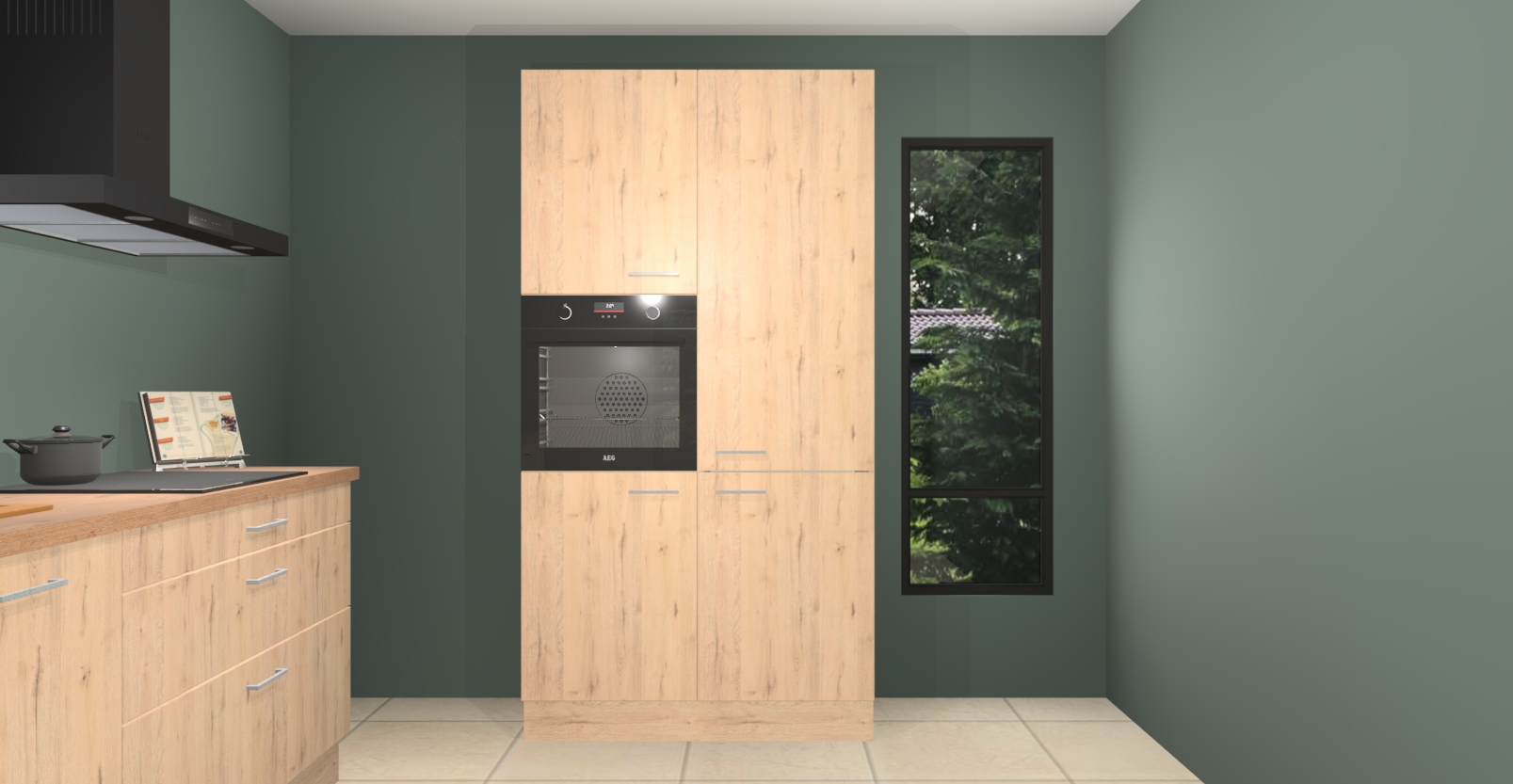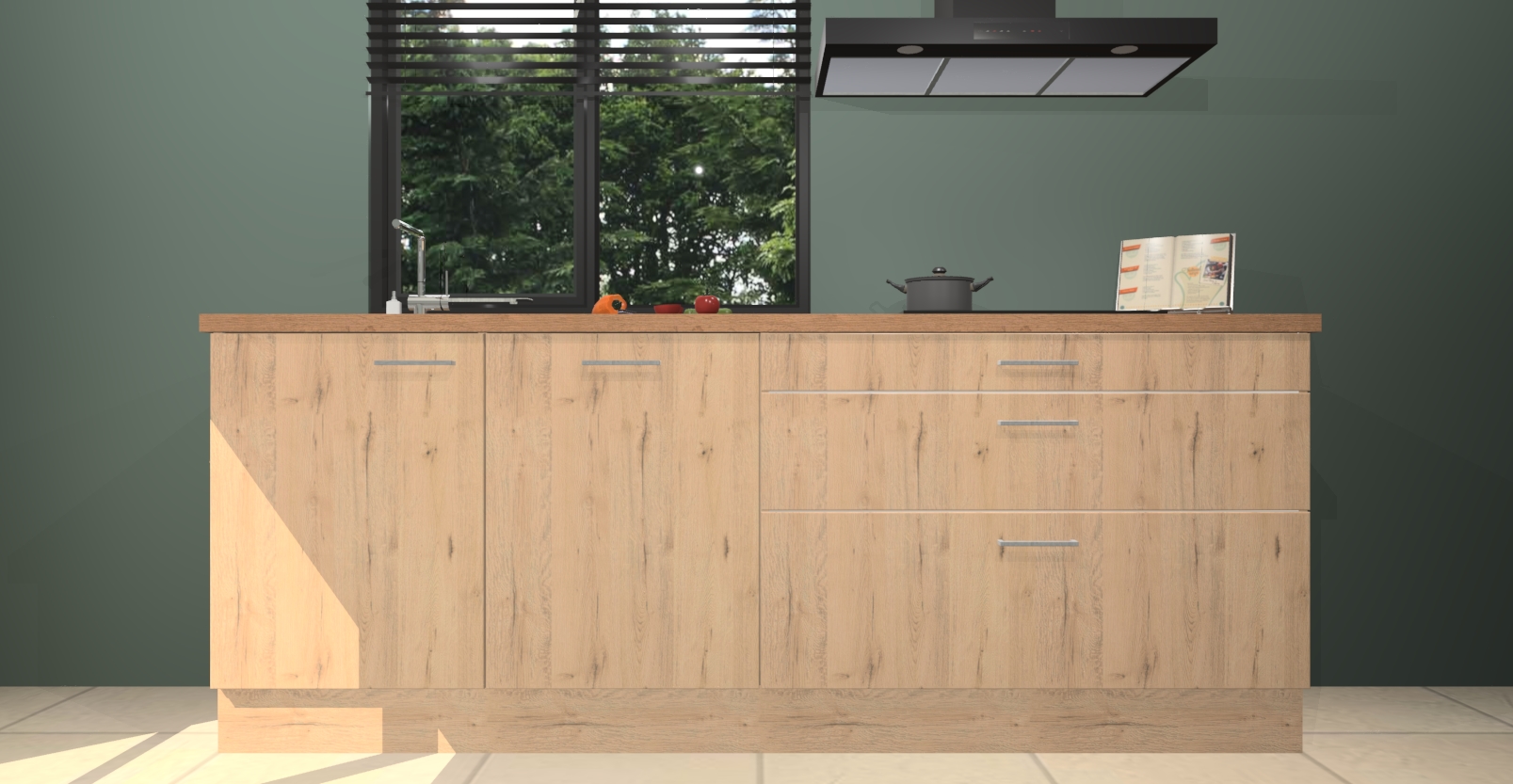 De setting is compleet gemaakt door de vijf inbouwapparaten: wanneer u gaat bestellen kunt u upgraden naar AEG-apparaten als oven, inductieplaat, afzuigkap, vaatwasser en koelkast. Kiest u voor onze Madera natuur keuken Monaco, dan weet u zeker dat u te maken heeft met Duitse kwaliteit. Bovendien is er altijd sprake van een lage prijs en profiteren we aantrekkelijk leveringstermijn: die bedraagt slechts 7 weken ! Om het extra makkelijk te maken worden de keukenkasten reeds voorgemonteerd geleverd.