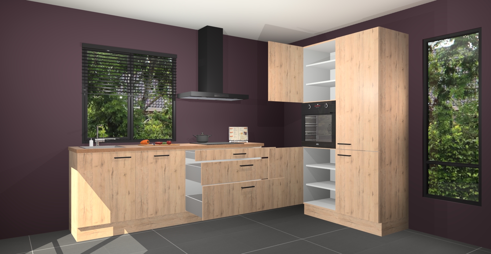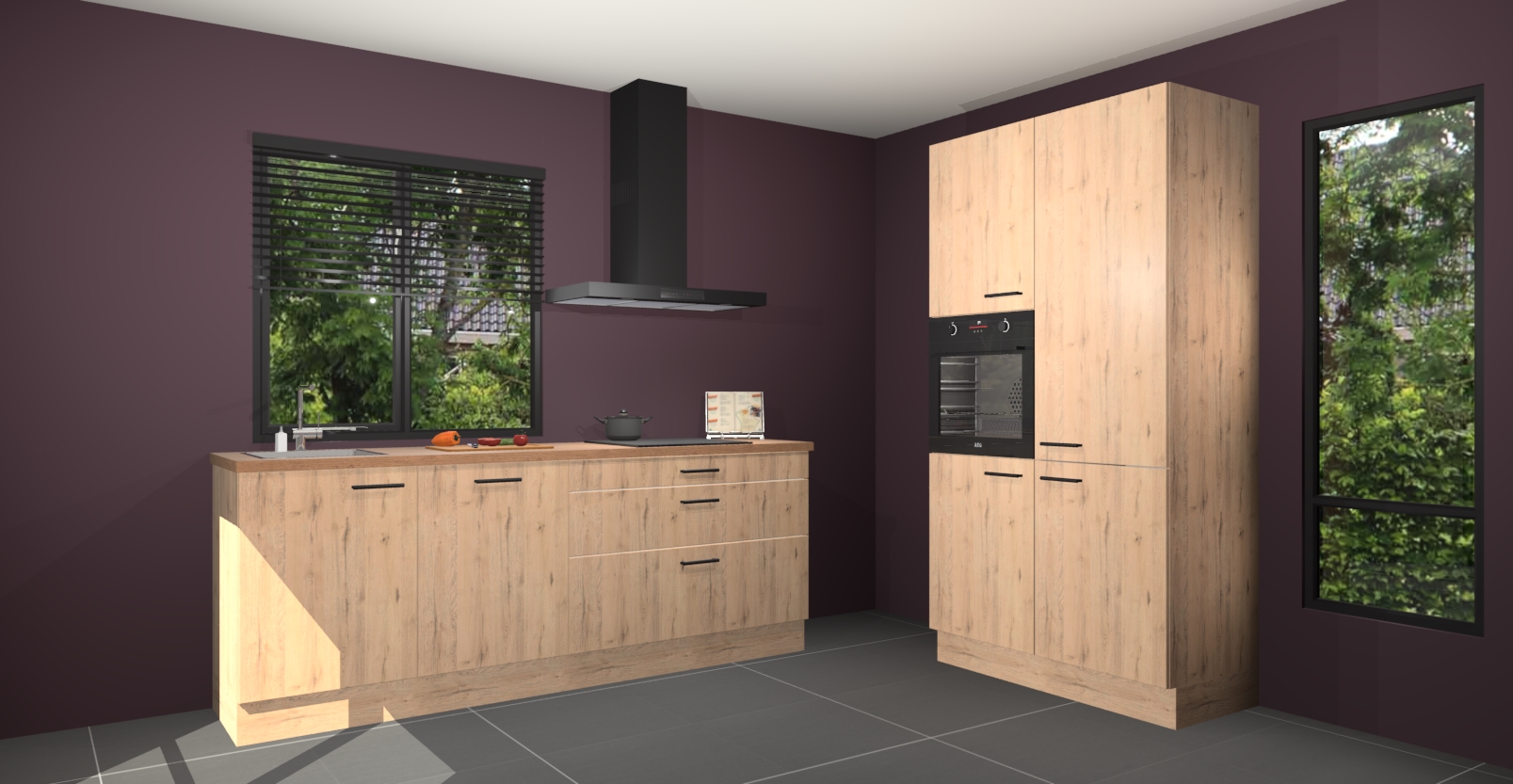 De setting is compleet gemaakt door de vijf inbouwapparaten: wanneer u gaat bestellen kunt u upgraden naar AEG-apparaten als oven, inductieplaat, afzuigkap, vaatwasser en koelkast. Kiest u voor onze Madera natuur keuken Monaco, dan weet u zeker dat u te maken heeft met Duitse kwaliteit. Bovendien is er altijd sprake van een lage prijs en profiteren we aantrekkelijk leveringstermijn: die bedraagt slechts 7 weken ! Om het extra makkelijk te maken worden de keukenkasten reeds voorgemonteerd geleverd.