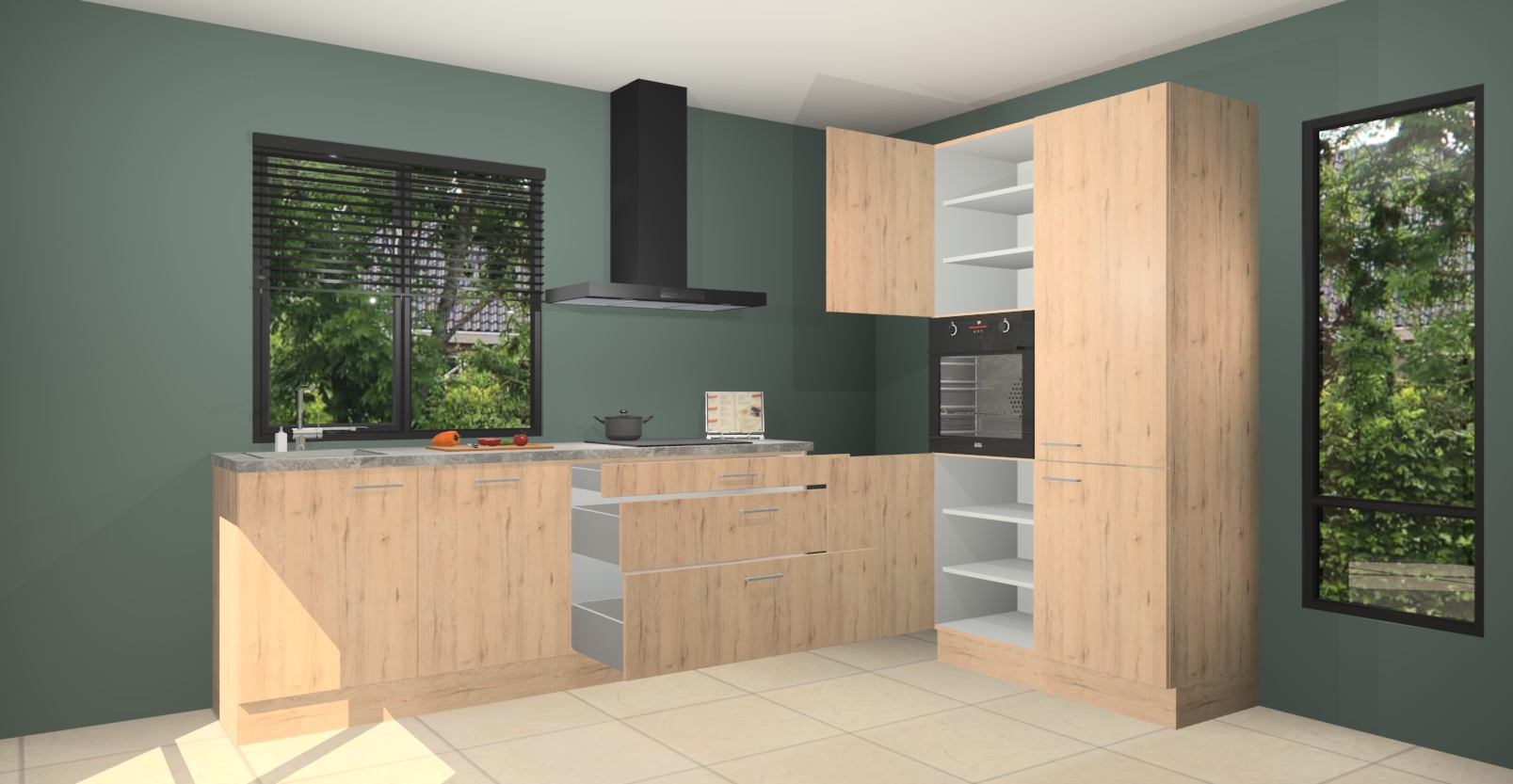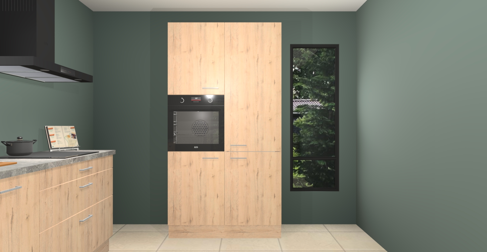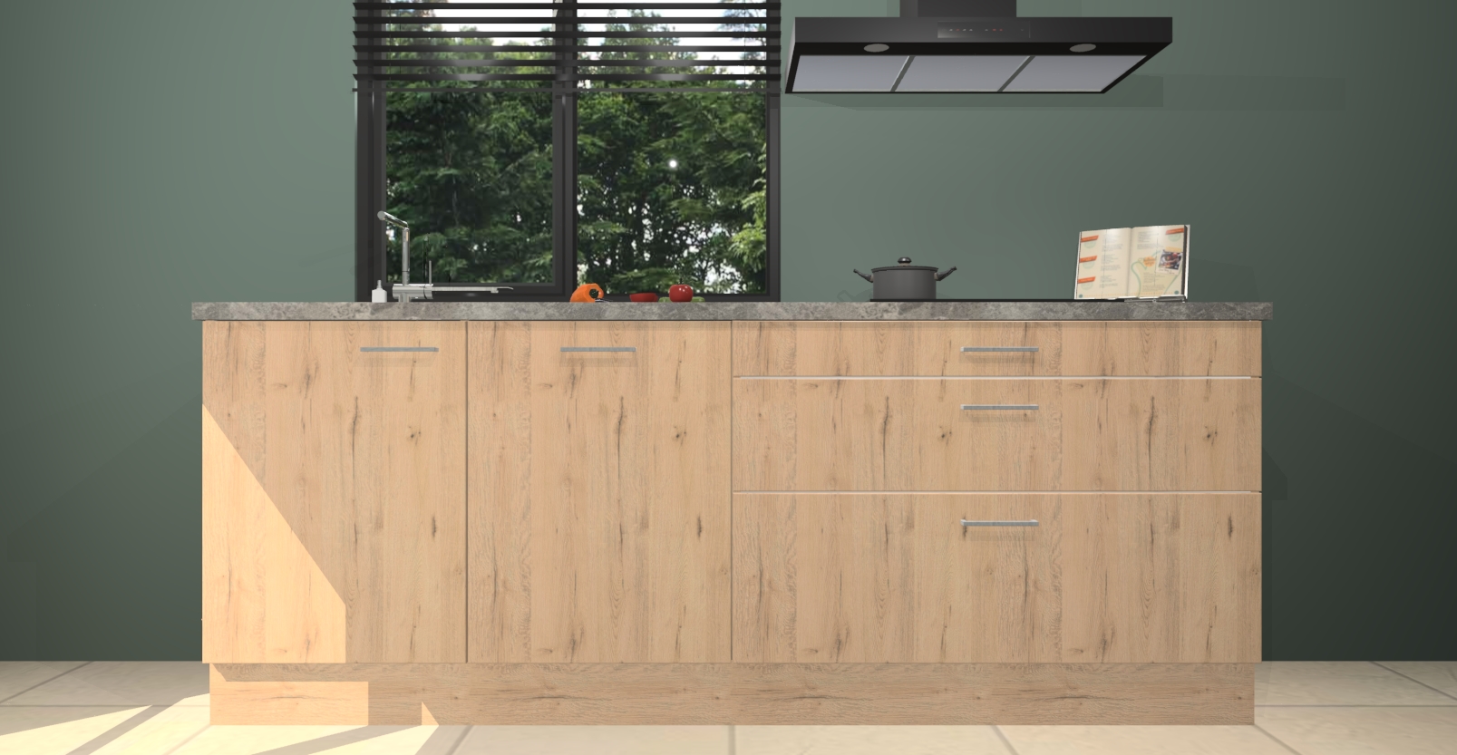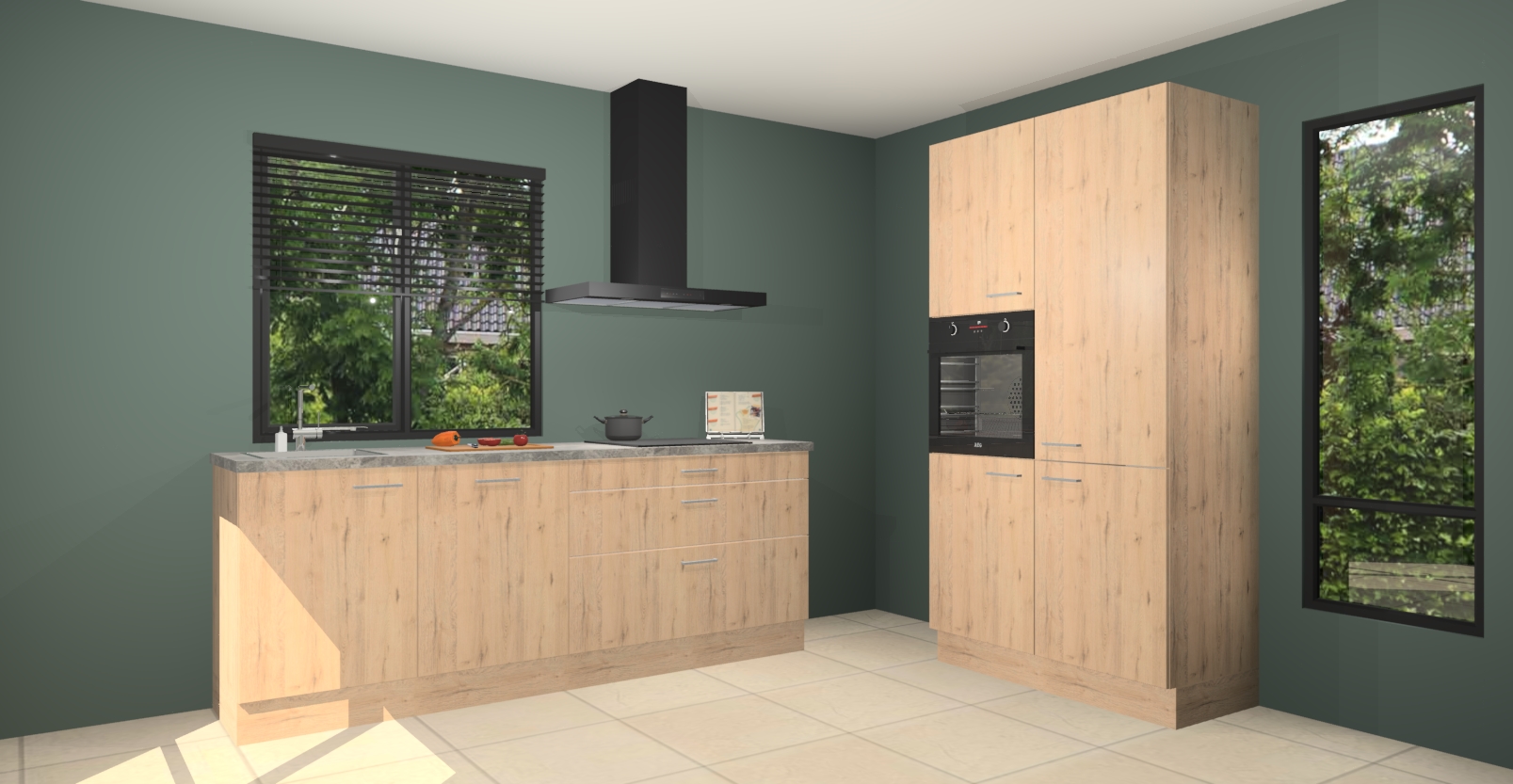 De setting is compleet gemaakt door de vijf inbouwapparaten: wanneer u gaat bestellen kunt u upgraden naar AEG-apparaten als oven, inductieplaat, afzuigkap, vaatwasser en koelkast. Kiest u voor onze Madera natuur keuken Monaco, dan weet u zeker dat u te maken heeft met Duitse kwaliteit. Bovendien is er altijd sprake van een lage prijs en profiteren we aantrekkelijk leveringstermijn: die bedraagt slechts 7 weken ! Om het extra makkelijk te maken worden de keukenkasten reeds voorgemonteerd geleverd.