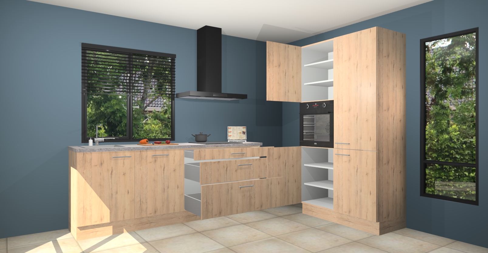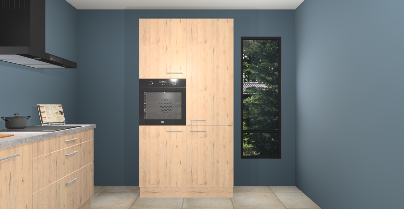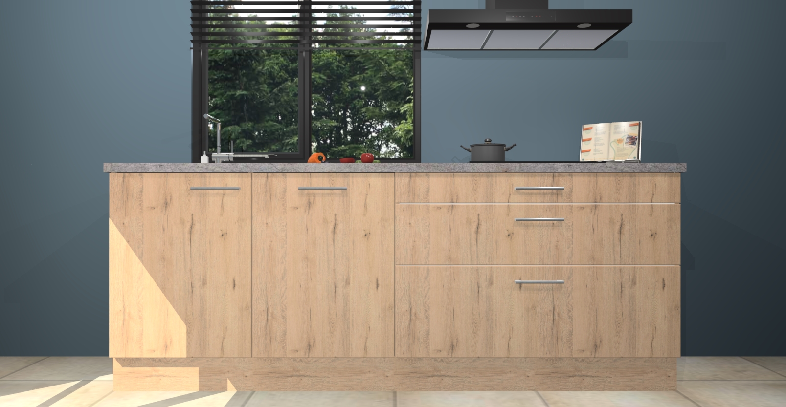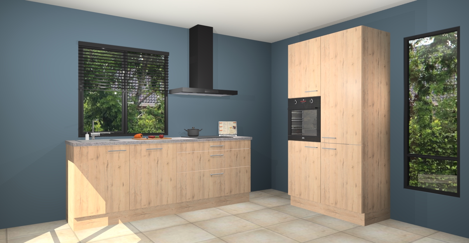 De setting is compleet gemaakt door de vijf inbouwapparaten: wanneer u gaat bestellen kunt u upgraden naar AEG-apparaten als oven, inductieplaat, afzuigkap, vaatwasser en koelkast. Kiest u voor onze Madera natuur keuken Monaco, dan weet u zeker dat u te maken heeft met Duitse kwaliteit. Bovendien is er altijd sprake van een lage prijs en profiteren we aantrekkelijk leveringstermijn: die bedraagt slechts 7 weken ! Om het extra makkelijk te maken worden de keukenkasten reeds voorgemonteerd geleverd.