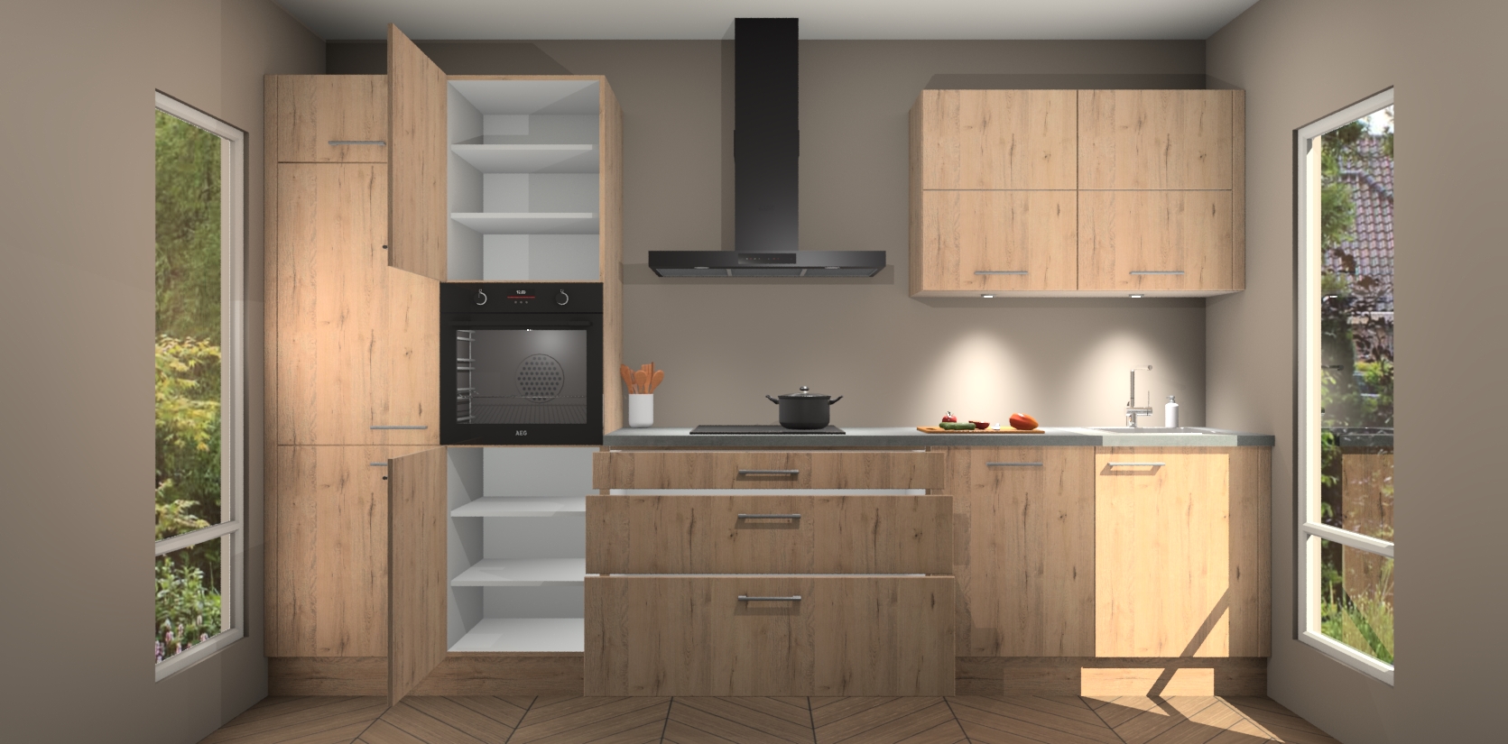 Maak kennis met de nieuwe Madera Natuur Keuken Parijs - de perfecte designcombinatie van gemak, moderne elegantie en ultramodern design. Met een gemakkelijk te reinigen Madera Natuur afwerking, zal de slankheid van deze keuken zeker een vleugje luxe toevoegen aan elke ruimte die hij inneemt.