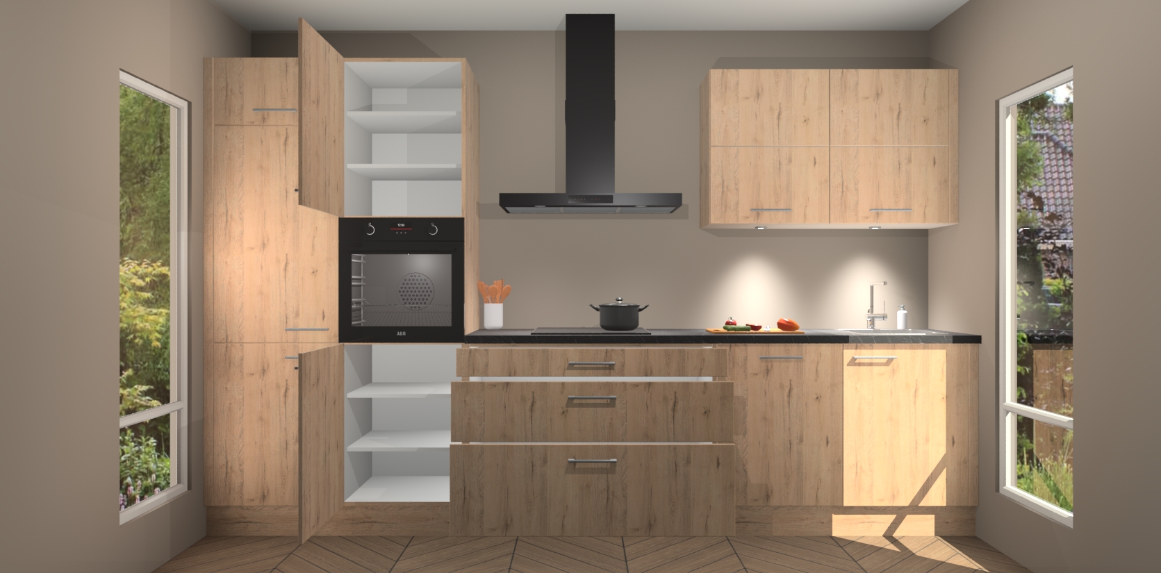 Maak kennis met de nieuwe Madera Natuur Keuken Parijs - de perfecte designcombinatie van gemak, moderne elegantie en ultramodern design. Met een gemakkelijk te reinigen Madera Natuur afwerking, zal de slankheid van deze keuken zeker een vleugje luxe toevoegen aan elke ruimte die hij inneemt.