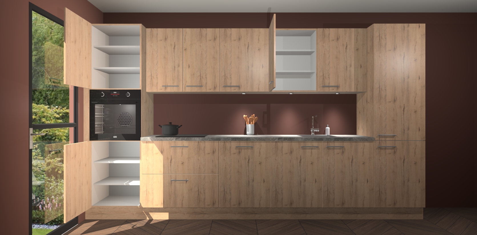 Dit is de perfecte keuken voor wie op zoek is naar een luxueuze stijl zonder zijn portemonnee te legen! Het chique ontwerp van de madera natuur keuken Wels voegt dat vleugje verfijning toe aan elk huis. Het gemak van voorgemonteerde kasten bespaart u talloze uren tijd en energie, zodat u veel sneller dan verwacht kunt beginnen te genieten van uw prachtige nieuwe keuken. Bovendien bedraagt de levertijd slechts 7 weken.