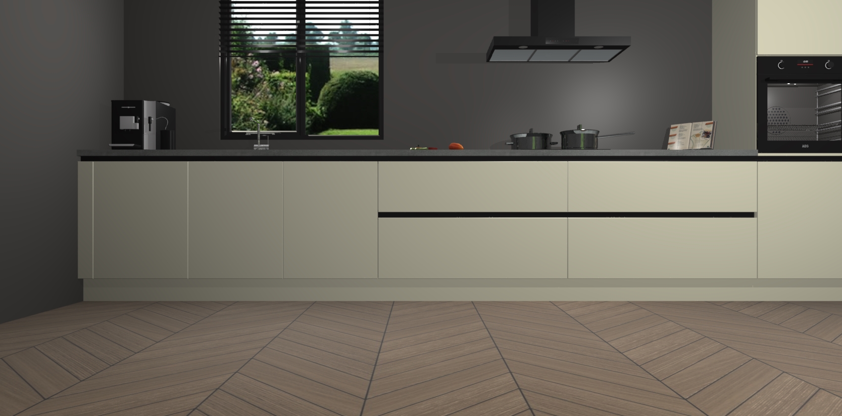 Een stijlvolle en praktische keuken als deze mag gezien worden. Dankzij de prachtige matte afwerking wordt de keuken gemakkelijk het middelpunt van uw huis - hij ziet er geweldig uit onder allerlei lichtomstandigheden, van dag tot nacht!