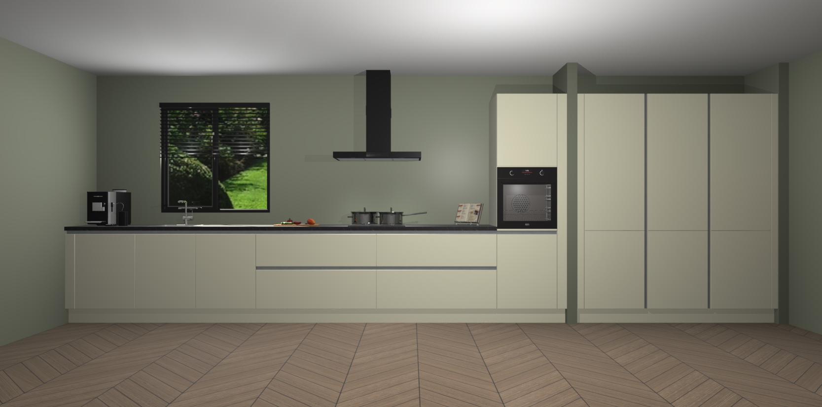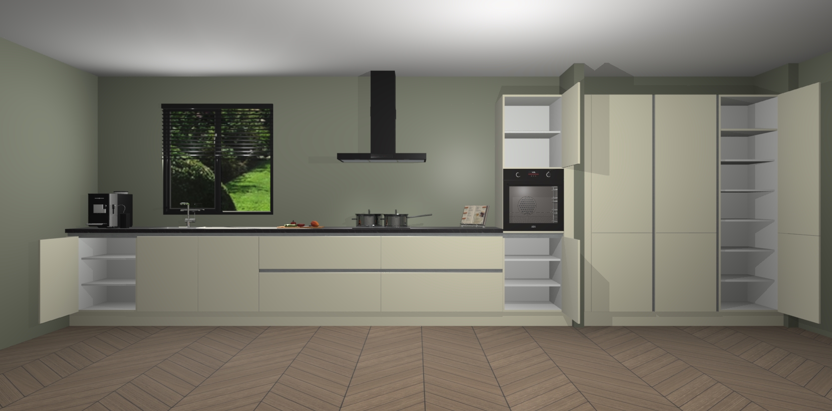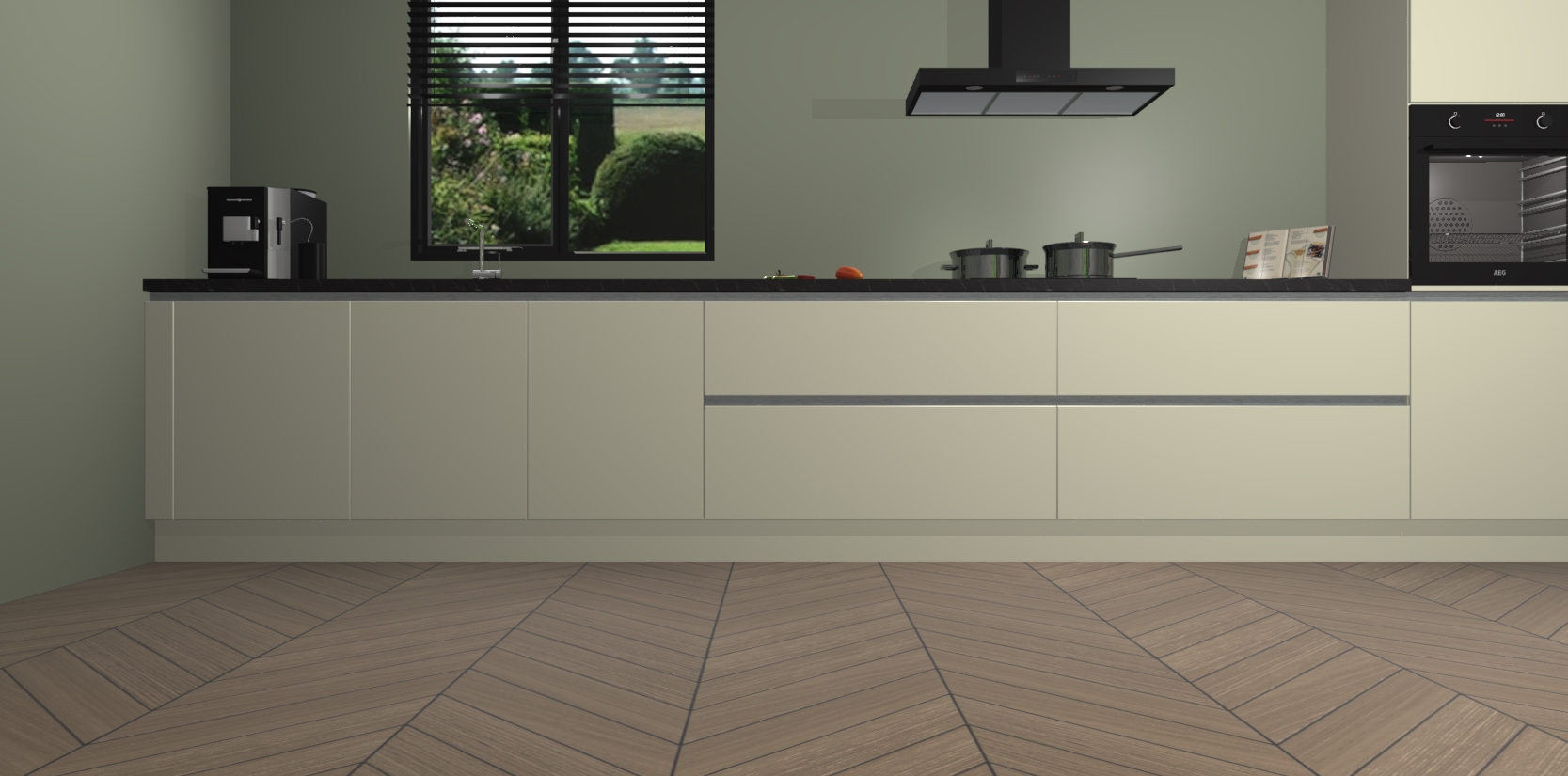Een stijlvolle en praktische keuken als deze mag gezien worden. Dankzij de prachtige matte afwerking wordt de keuken gemakkelijk het middelpunt van uw huis - hij ziet er geweldig uit onder allerlei lichtomstandigheden, van dag tot nacht!