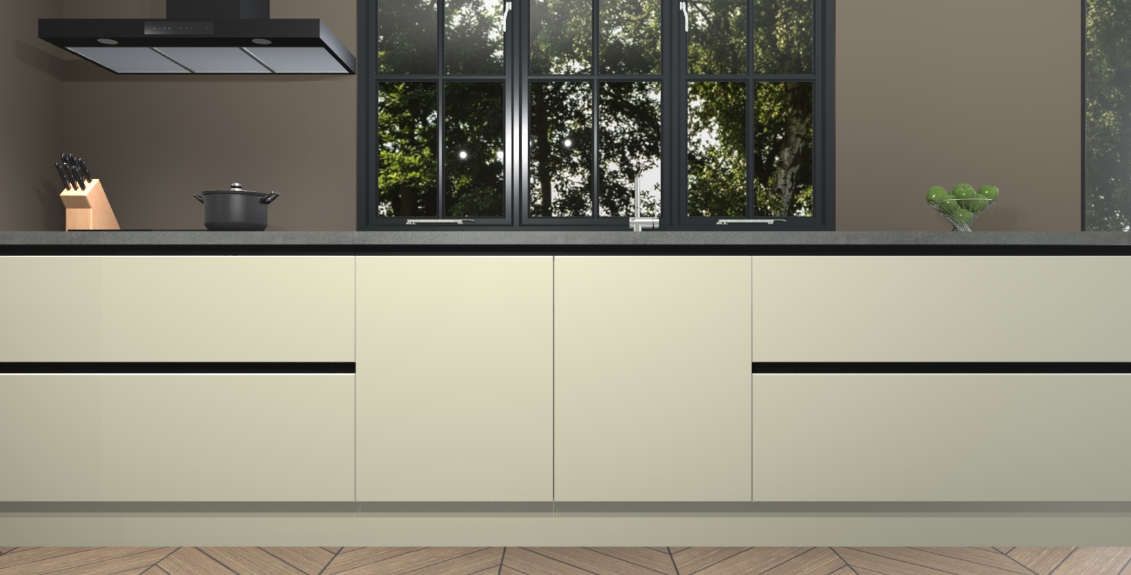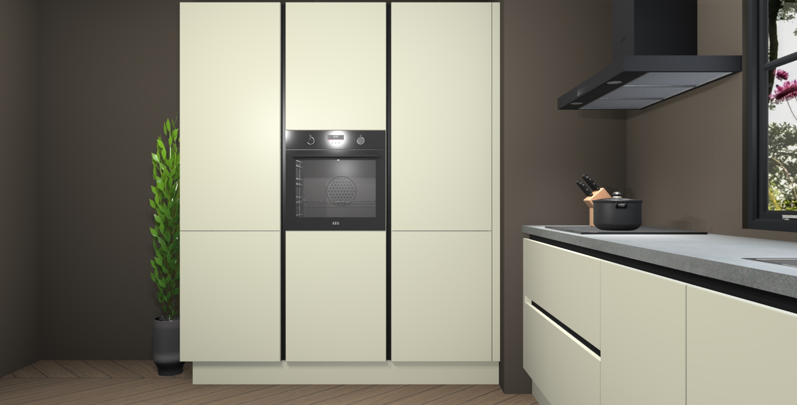 De softclose deuren openen en sluiten is ook heel eenvoudig - geniet van een moeiteloze keukenervaring, zelfs als er kinderen rondlopen. Voor extra gemak bij het plaatsen van uw bestelling bieden we ook een upgrade naar een kookplaat met geïntegreerde afzuiging.