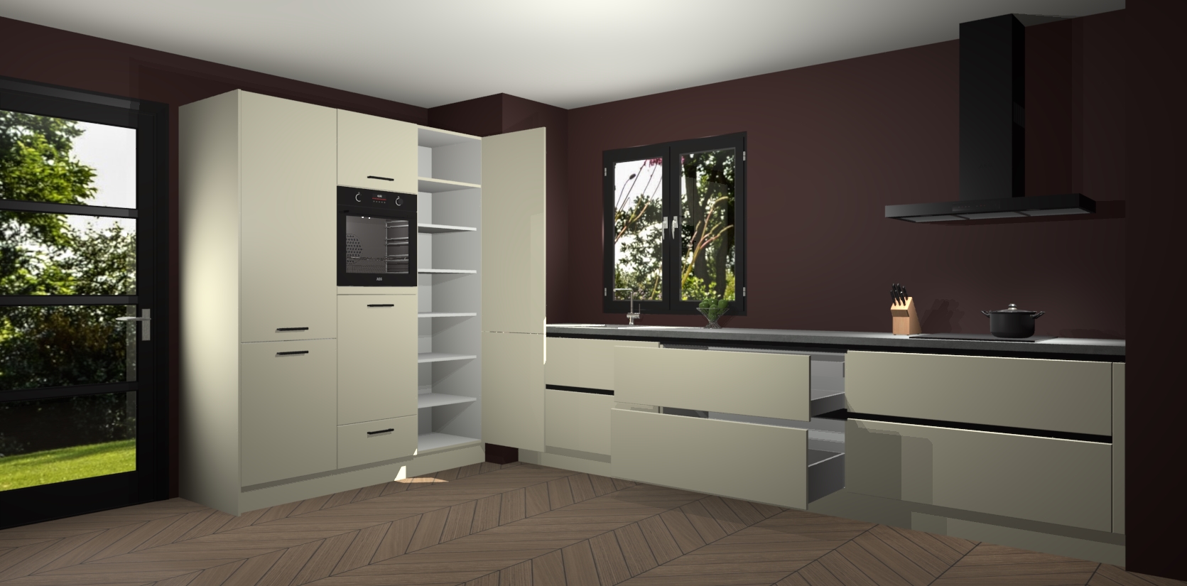 De softclose deuren openen en sluiten is ook heel eenvoudig - geniet van een moeiteloze keukenervaring, zelfs als er kinderen rondlopen. Voor extra gemak bij het plaatsen van uw bestelling bieden we ook een upgrade naar een kookplaat met geïntegreerde afzuiging.