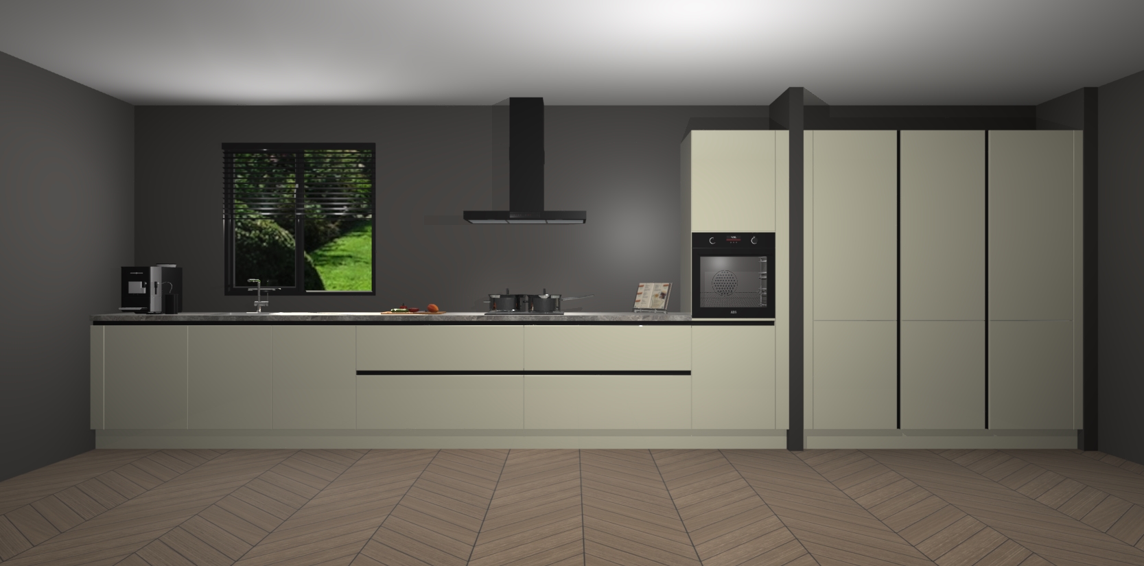 Een stijlvolle en praktische keuken als deze mag gezien worden. Dankzij de prachtige matte afwerking wordt de keuken gemakkelijk het middelpunt van uw huis - hij ziet er geweldig uit onder allerlei lichtomstandigheden, van dag tot nacht!