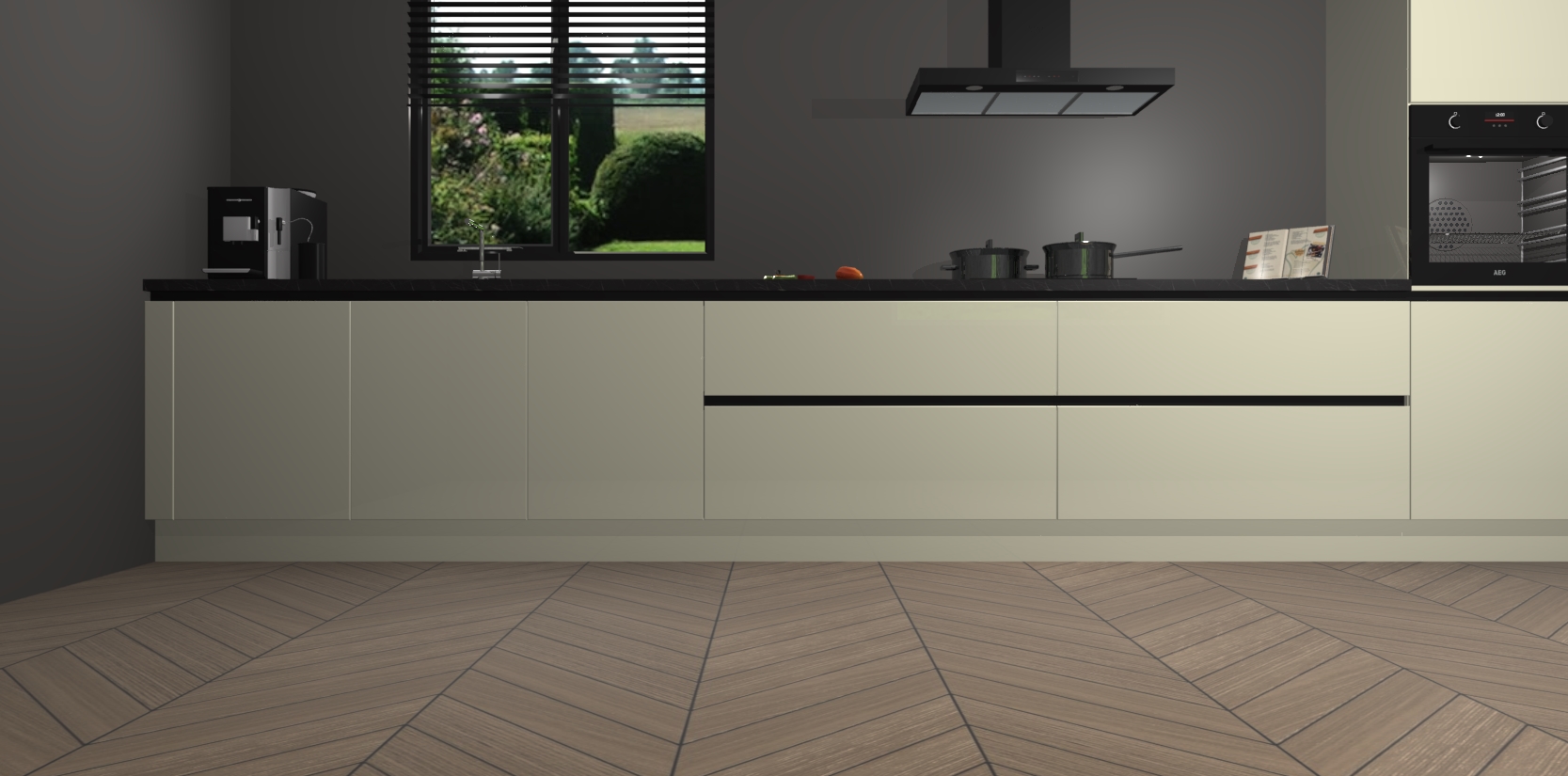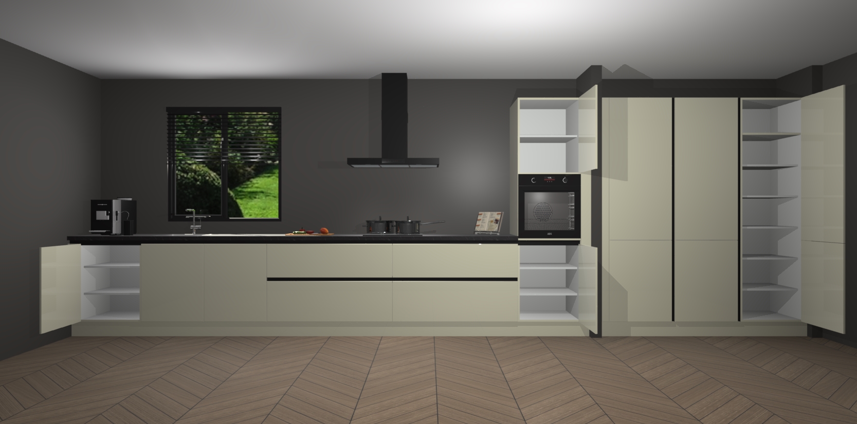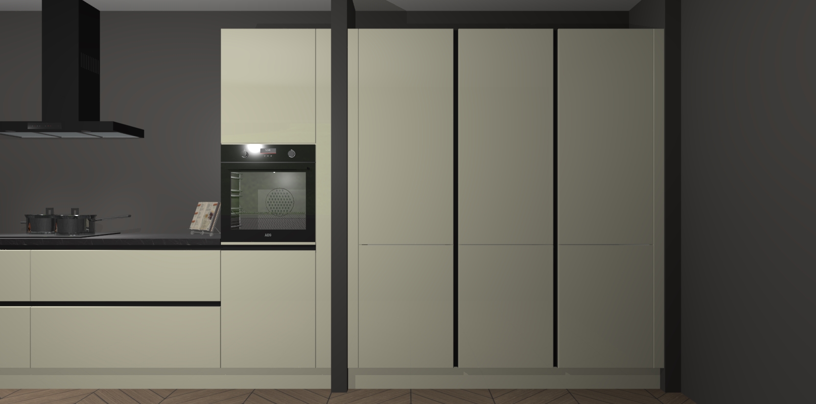 Een stijlvolle en praktische keuken als deze mag gezien worden. Dankzij de prachtige matte afwerking wordt de keuken gemakkelijk het middelpunt van uw huis - hij ziet er geweldig uit onder allerlei lichtomstandigheden, van dag tot nacht!