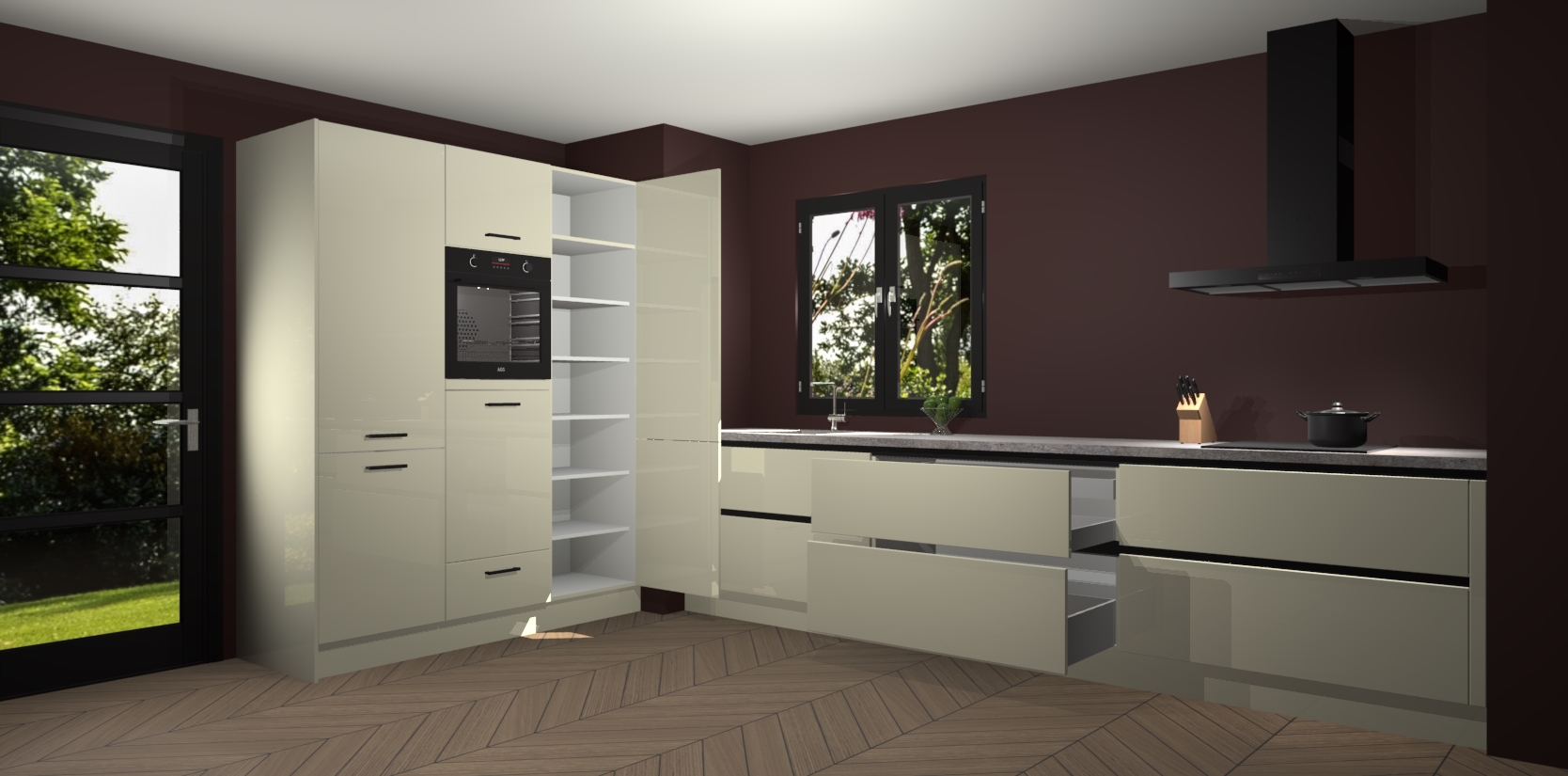 De softclose deuren openen en sluiten is ook heel eenvoudig - geniet van een moeiteloze keukenervaring, zelfs als er kinderen rondlopen. Voor extra gemak bij het plaatsen van uw bestelling bieden we ook een upgrade naar een kookplaat met geïntegreerde afzuiging.