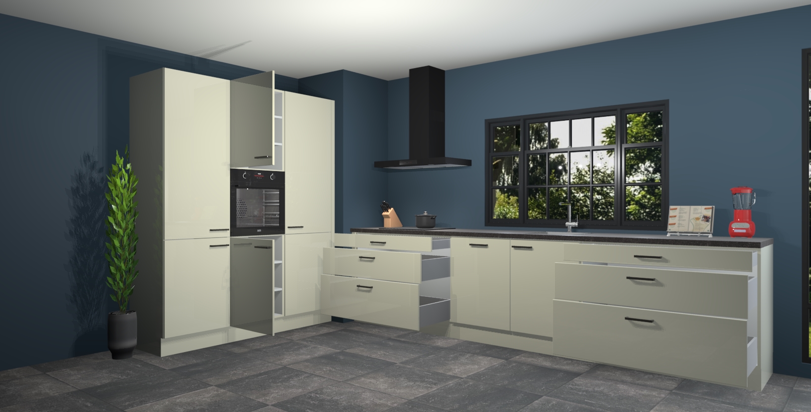 De softclose deuren openen en sluiten is ook heel eenvoudig - geniet van een moeiteloze keukenervaring, zelfs als er kinderen rondlopen. Voor extra gemak bij het plaatsen van uw bestelling bieden we ook een upgrade naar een kookplaat met geïntegreerde afzuiging.