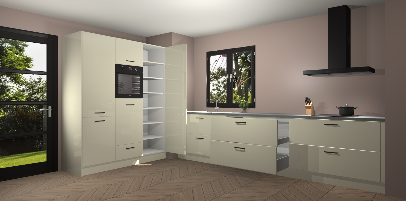 De softclose deuren openen en sluiten is ook heel eenvoudig - geniet van een moeiteloze keukenervaring, zelfs als er kinderen rondlopen. Voor extra gemak bij het plaatsen van uw bestelling bieden we ook een upgrade naar een kookplaat met geïntegreerde afzuiging.