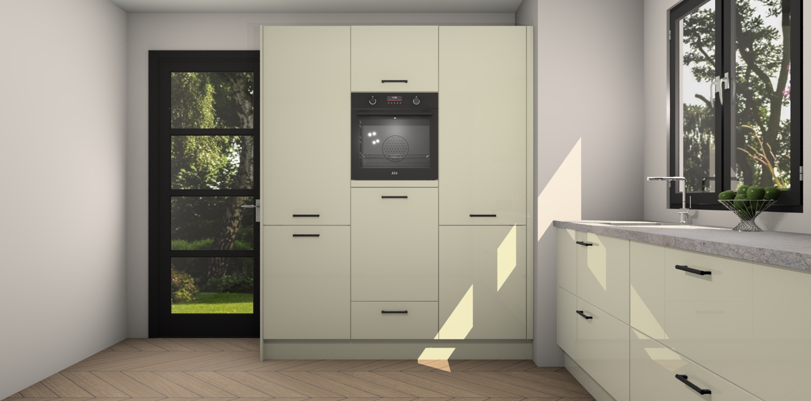 De softclose deuren openen en sluiten is ook heel eenvoudig - geniet van een moeiteloze keukenervaring, zelfs als er kinderen rondlopen. Voor extra gemak bij het plaatsen van uw bestelling bieden we ook een upgrade naar een kookplaat met geïntegreerde afzuiging.