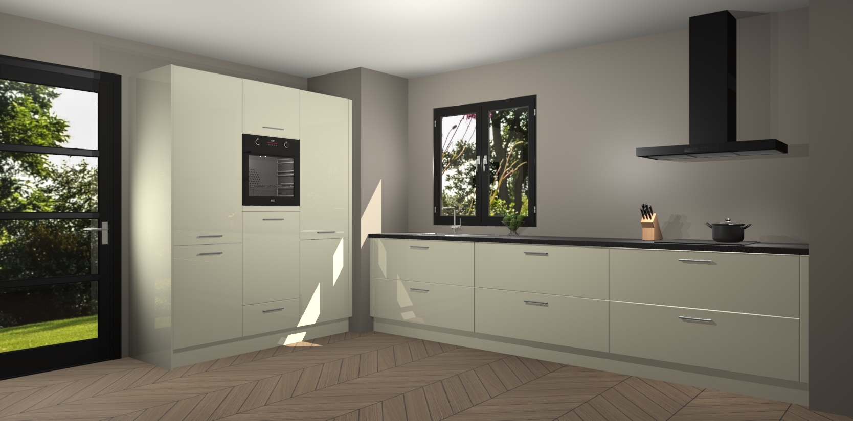 De softclose deuren openen en sluiten is ook heel eenvoudig - geniet van een moeiteloze keukenervaring, zelfs als er kinderen rondlopen. Voor extra gemak bij het plaatsen van uw bestelling bieden we ook een upgrade naar een kookplaat met geïntegreerde afzuiging.