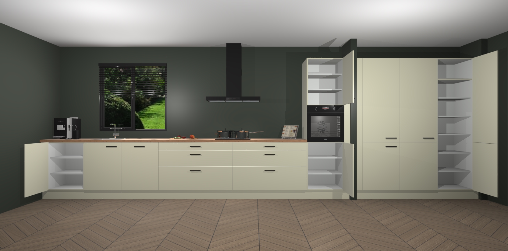 Een stijlvolle en praktische keuken als deze mag gezien worden. Dankzij de prachtige matte afwerking wordt de keuken gemakkelijk het middelpunt van uw huis - hij ziet er geweldig uit onder allerlei lichtomstandigheden, van dag tot nacht!
