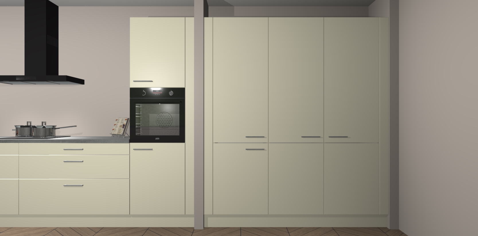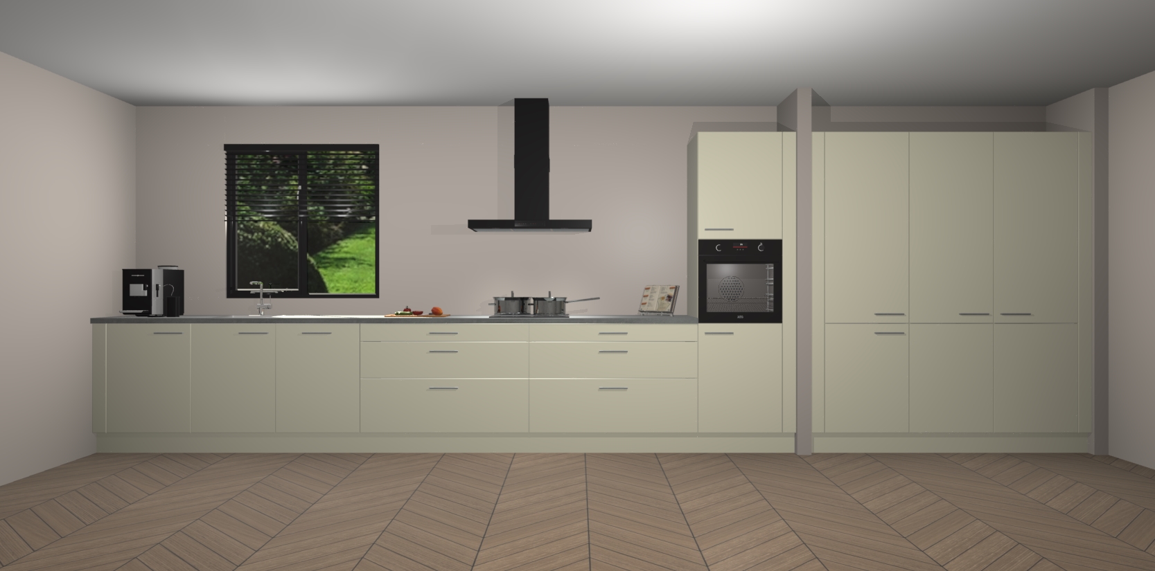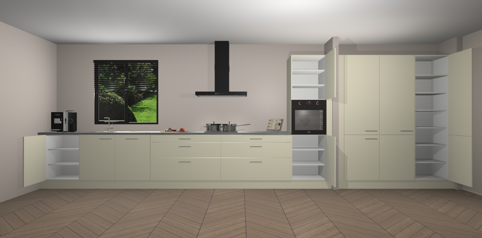 Een stijlvolle en praktische keuken als deze mag gezien worden. Dankzij de prachtige matte afwerking wordt de keuken gemakkelijk het middelpunt van uw huis - hij ziet er geweldig uit onder allerlei lichtomstandigheden, van dag tot nacht!