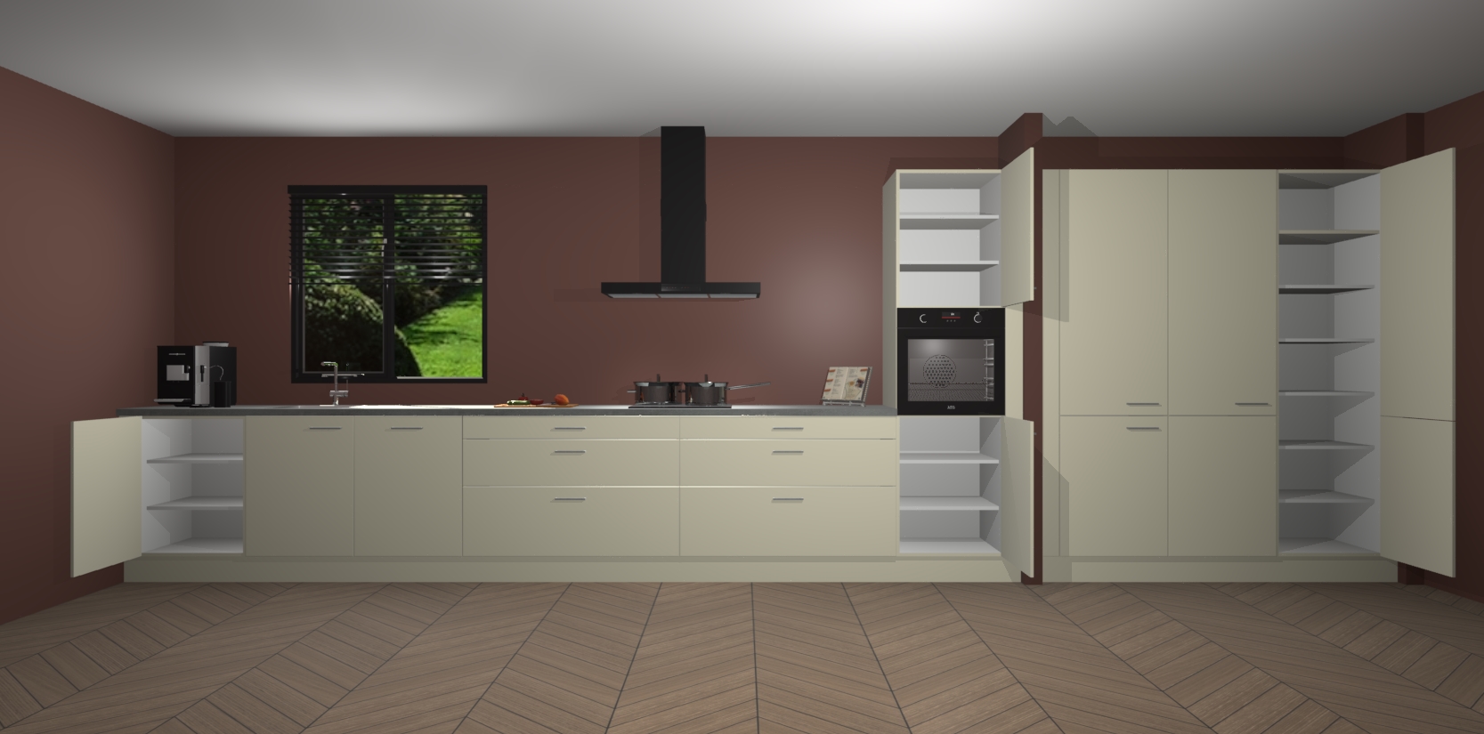 Een stijlvolle en praktische keuken als deze mag gezien worden. Dankzij de prachtige matte afwerking wordt de keuken gemakkelijk het middelpunt van uw huis - hij ziet er geweldig uit onder allerlei lichtomstandigheden, van dag tot nacht!