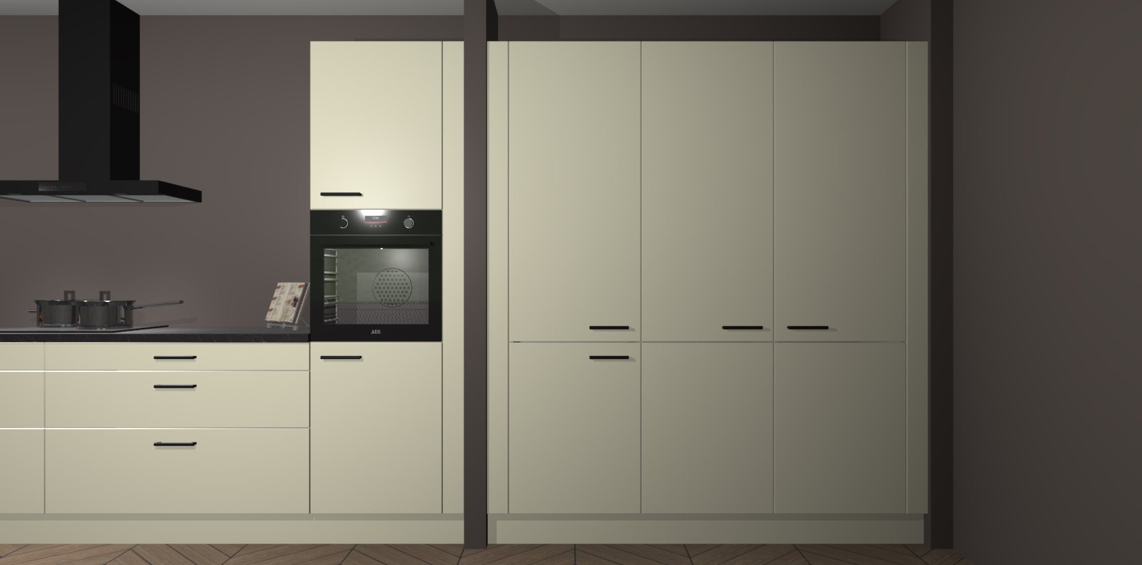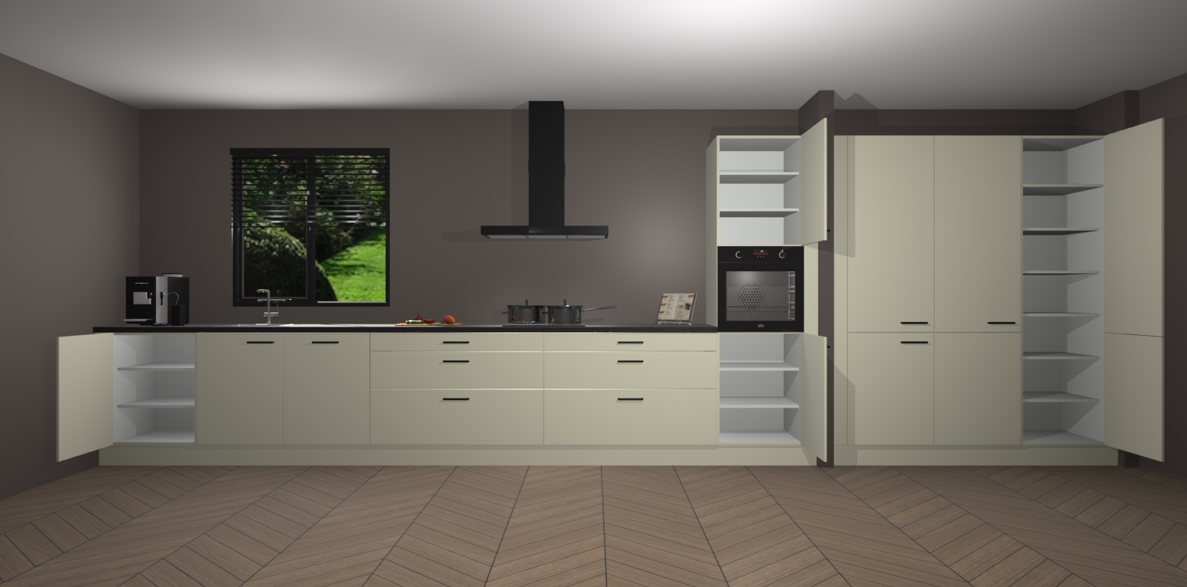 Een stijlvolle en praktische keuken als deze mag gezien worden. Dankzij de prachtige matte afwerking wordt de keuken gemakkelijk het middelpunt van uw huis - hij ziet er geweldig uit onder allerlei lichtomstandigheden, van dag tot nacht!