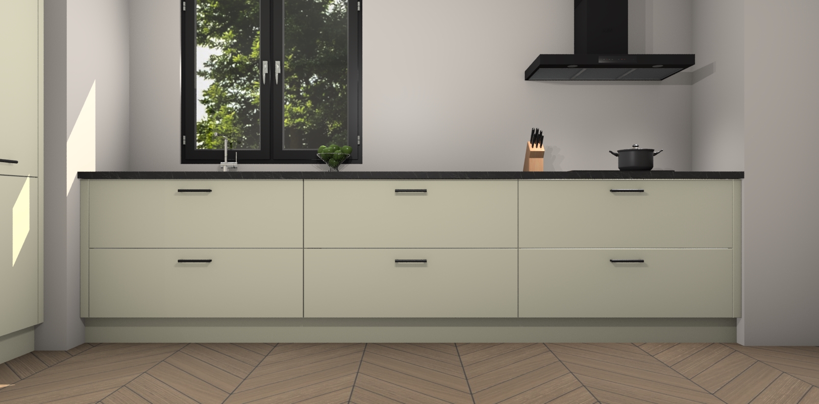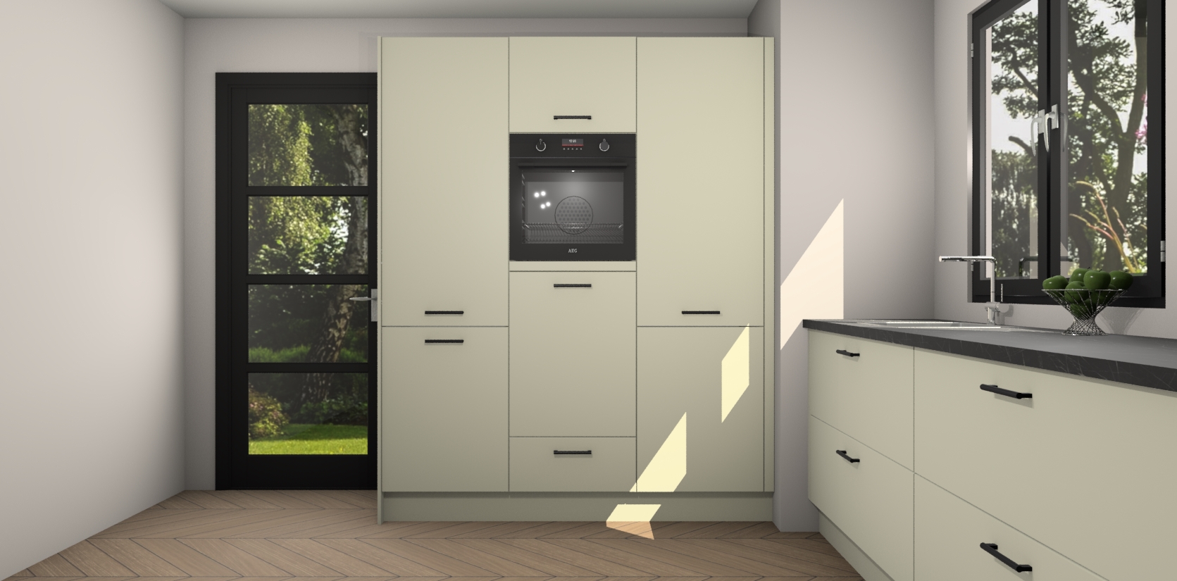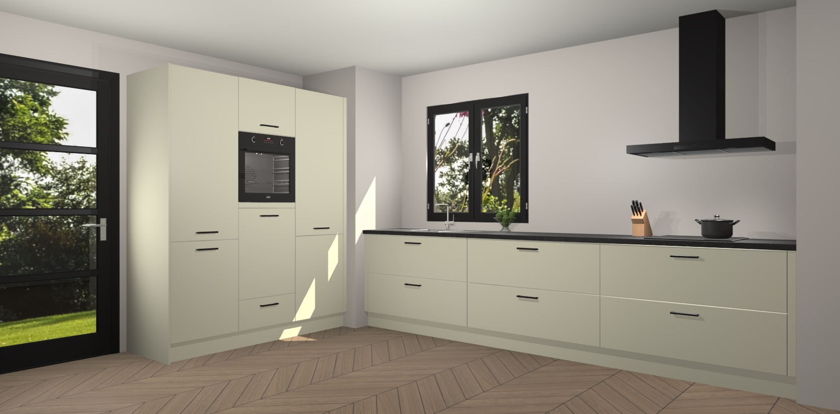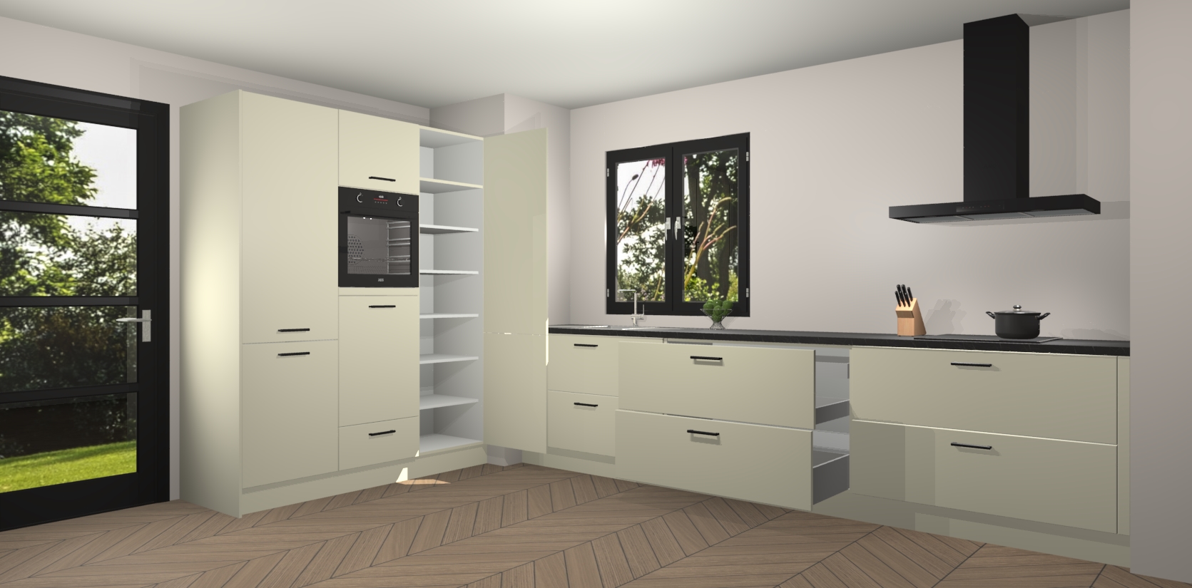 De softclose deuren openen en sluiten is ook heel eenvoudig - geniet van een moeiteloze keukenervaring, zelfs als er kinderen rondlopen. Voor extra gemak bij het plaatsen van uw bestelling bieden we ook een upgrade naar een kookplaat met geïntegreerde afzuiging.