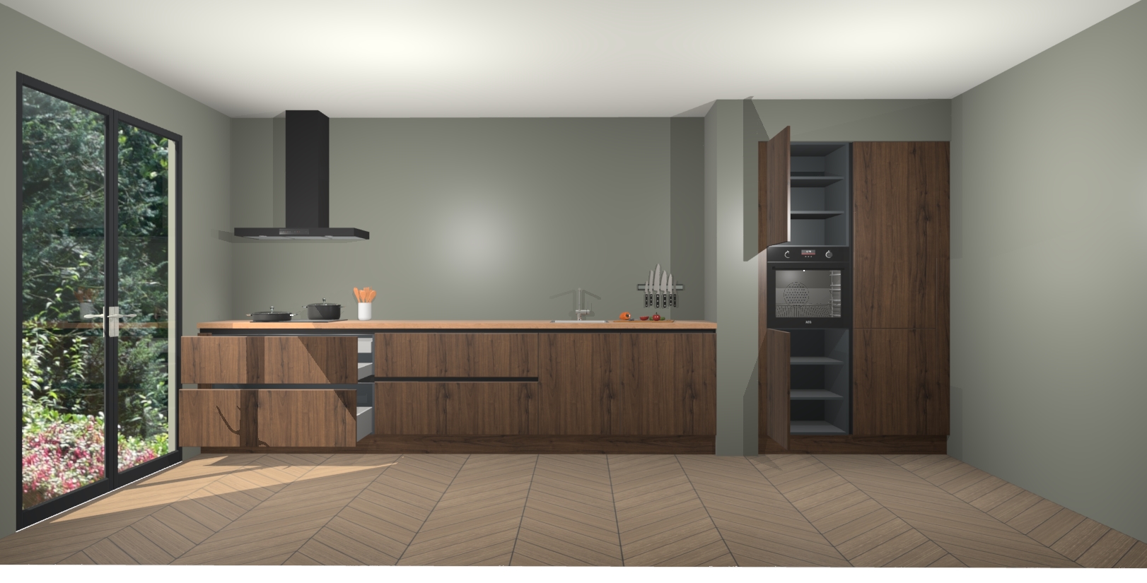 Met de Noten greeploze keuken Calgary Maakt u van uw keuken het pronkstuk van uw huis. Stijlvol en toch praktisch, de nieuwste look voor wie meer waarde en charme aan zijn huis wil toevoegen. Met prachtige handgrepen die zich lenen voor een klassieke stijlbron, zal u niet teleurgesteld zijn in het resultaat. De soft-close deurscharnieren geven een gevoel van luxe omdat ze zachtjes bewegen zonder storende of krakende geluiden te veroorzaken.