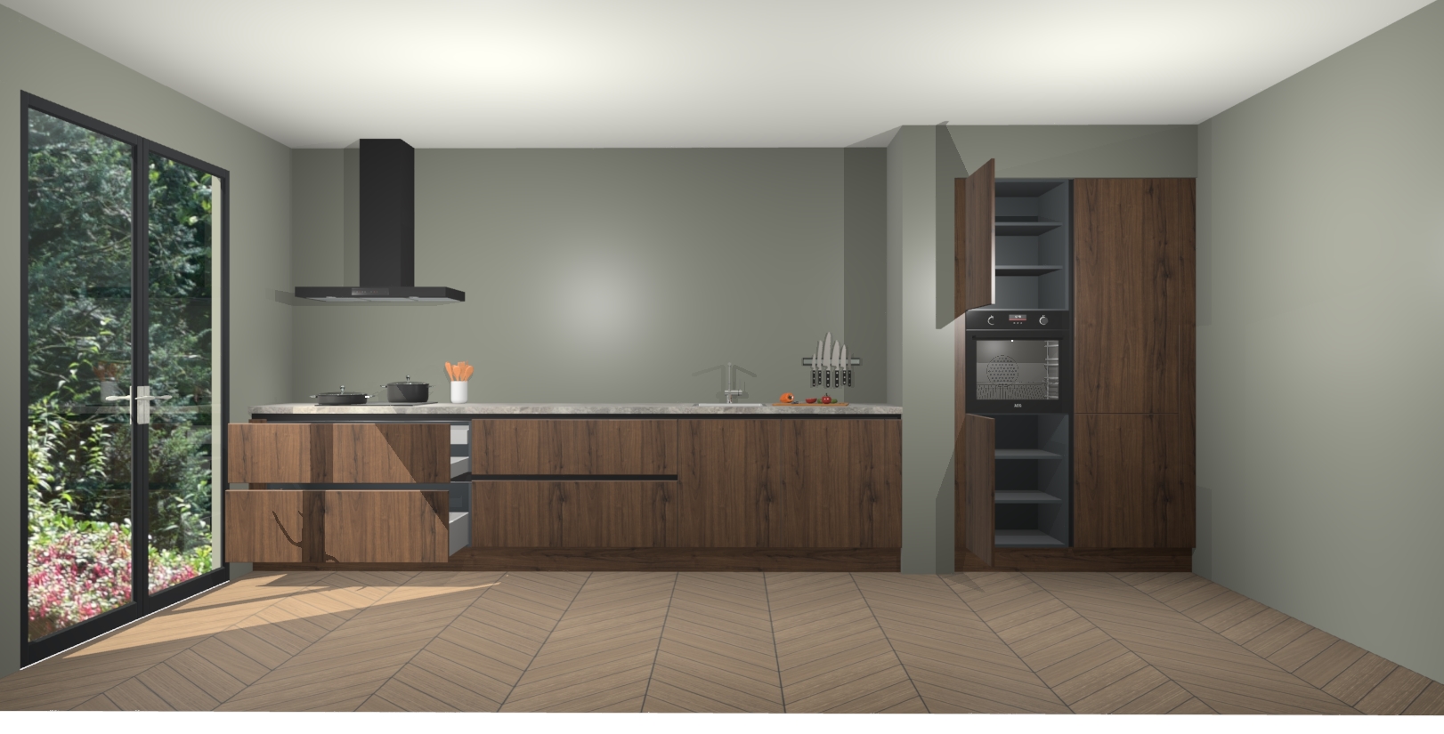 Met de Noten greeploze keuken Calgary Maakt u van uw keuken het pronkstuk van uw huis. Stijlvol en toch praktisch, de nieuwste look voor wie meer waarde en charme aan zijn huis wil toevoegen. Met prachtige handgrepen die zich lenen voor een klassieke stijlbron, zal u niet teleurgesteld zijn in het resultaat. De soft-close deurscharnieren geven een gevoel van luxe omdat ze zachtjes bewegen zonder storende of krakende geluiden te veroorzaken.