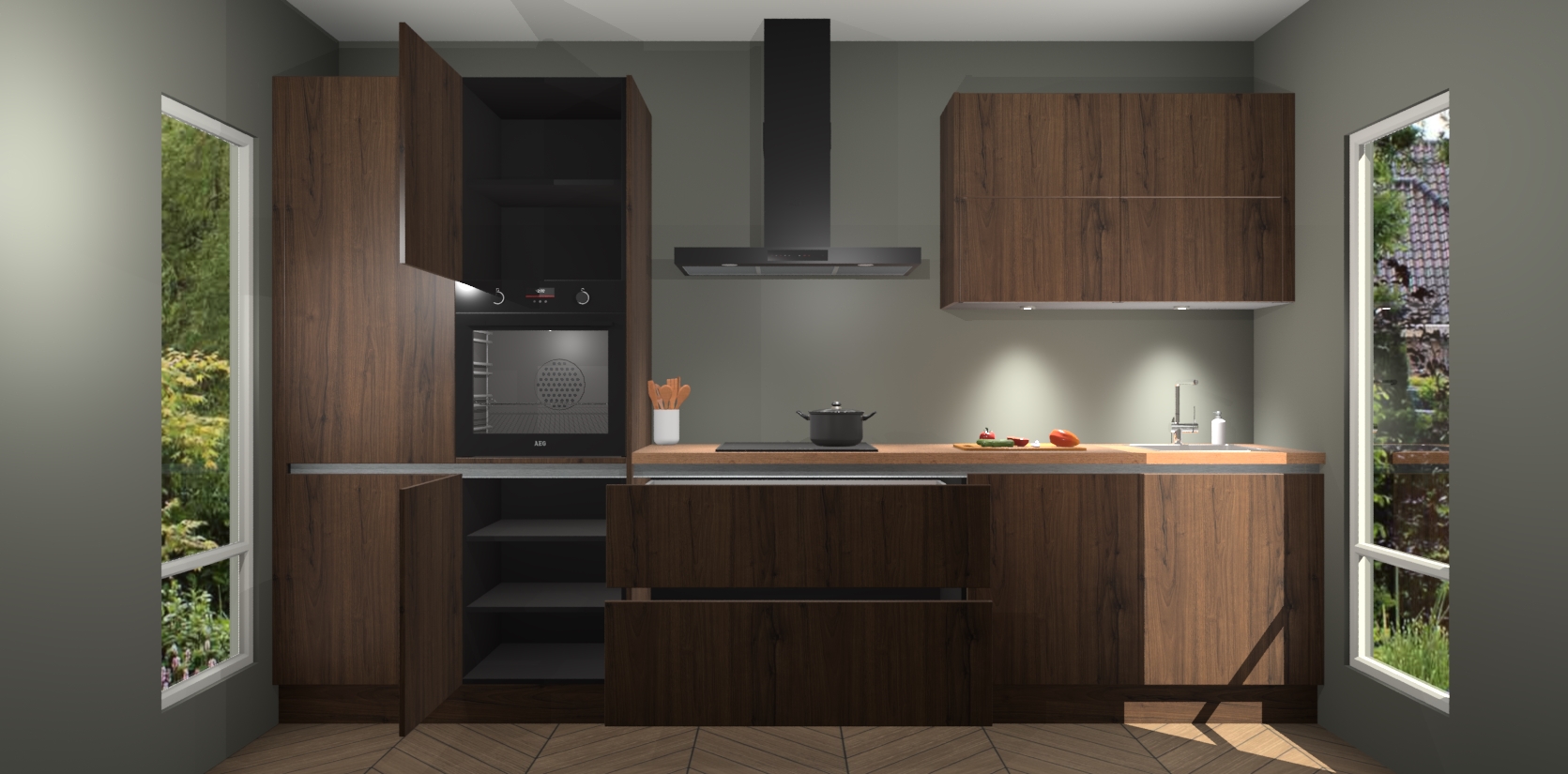 Maak kennis met de nieuwe Noten greeploze Keuken Parijs - de perfecte designcombinatie van gemak, moderne elegantie en ultramodern design. Met een gemakkelijk te reinigen Noten afwerking, zal de slankheid van deze keuken zeker een vleugje luxe toevoegen aan elke ruimte die hij inneemt.