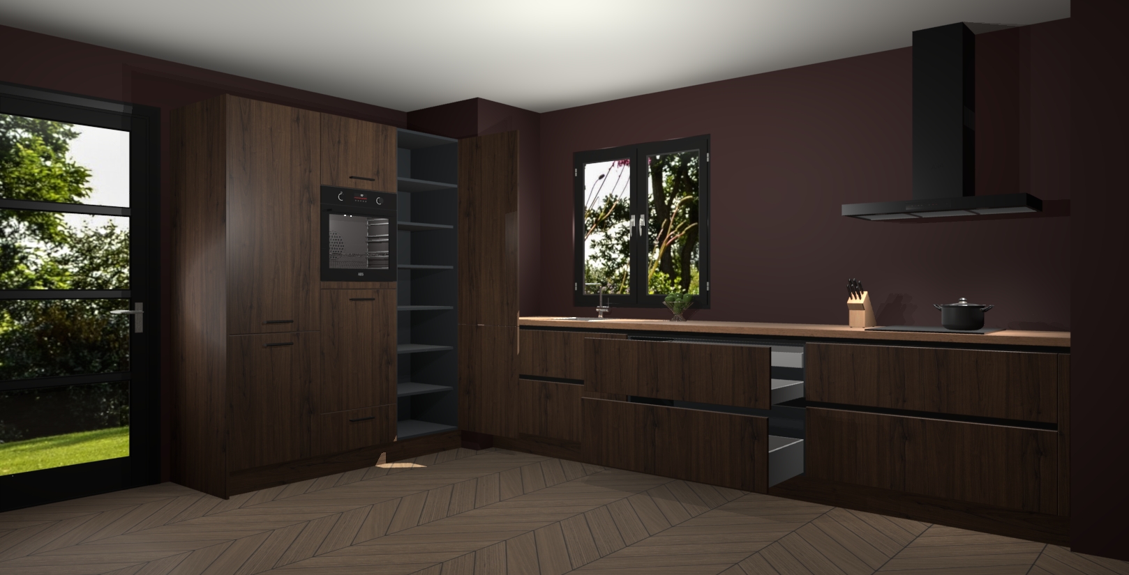 De softclose deuren openen en sluiten is ook heel eenvoudig - geniet van een moeiteloze keukenervaring, zelfs als er kinderen rondlopen. Voor extra gemak bij het plaatsen van uw bestelling bieden we ook een upgrade naar een kookplaat met geïntegreerde afzuiging.