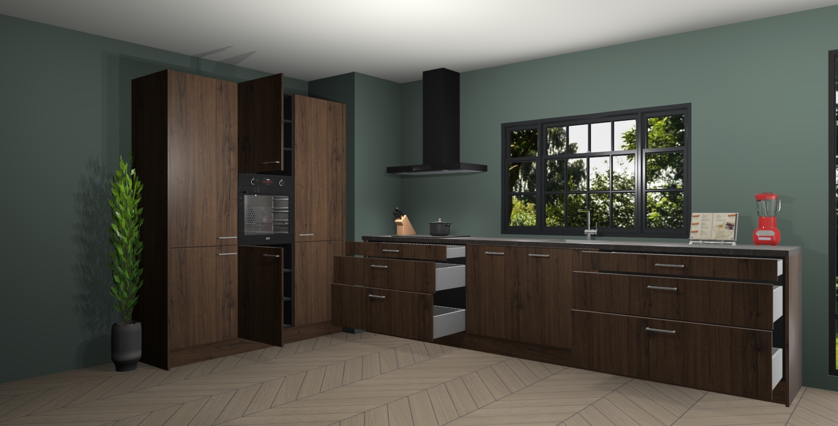 De softclose deuren openen en sluiten is ook heel eenvoudig - geniet van een moeiteloze keukenervaring, zelfs als er kinderen rondlopen. Voor extra gemak bij het plaatsen van uw bestelling bieden we ook een upgrade naar een kookplaat met geïntegreerde afzuiging.