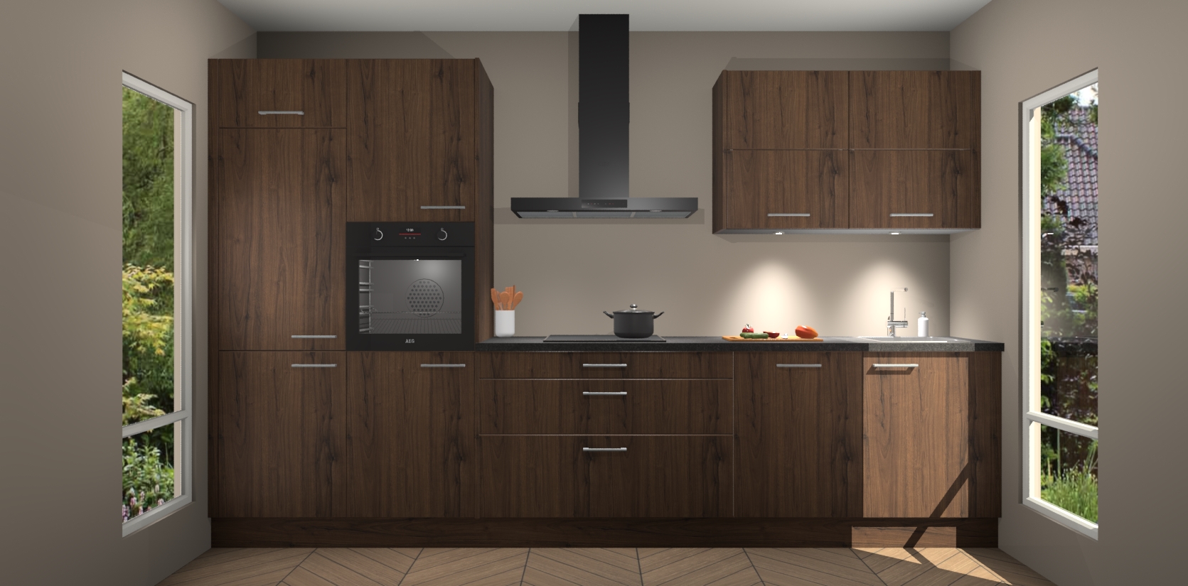 Maak kennis met de nieuwe Noten Keuken Parijs - de perfecte designcombinatie van gemak, moderne elegantie en ultramodern design. Met een gemakkelijk te reinigen Noten afwerking, zal de slankheid van deze keuken zeker een vleugje luxe toevoegen aan elke ruimte die hij inneemt.