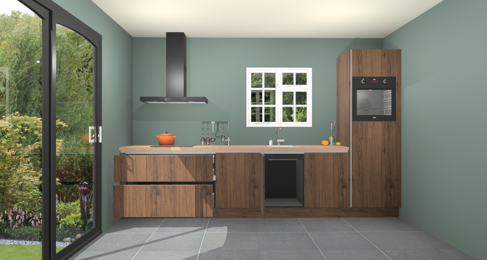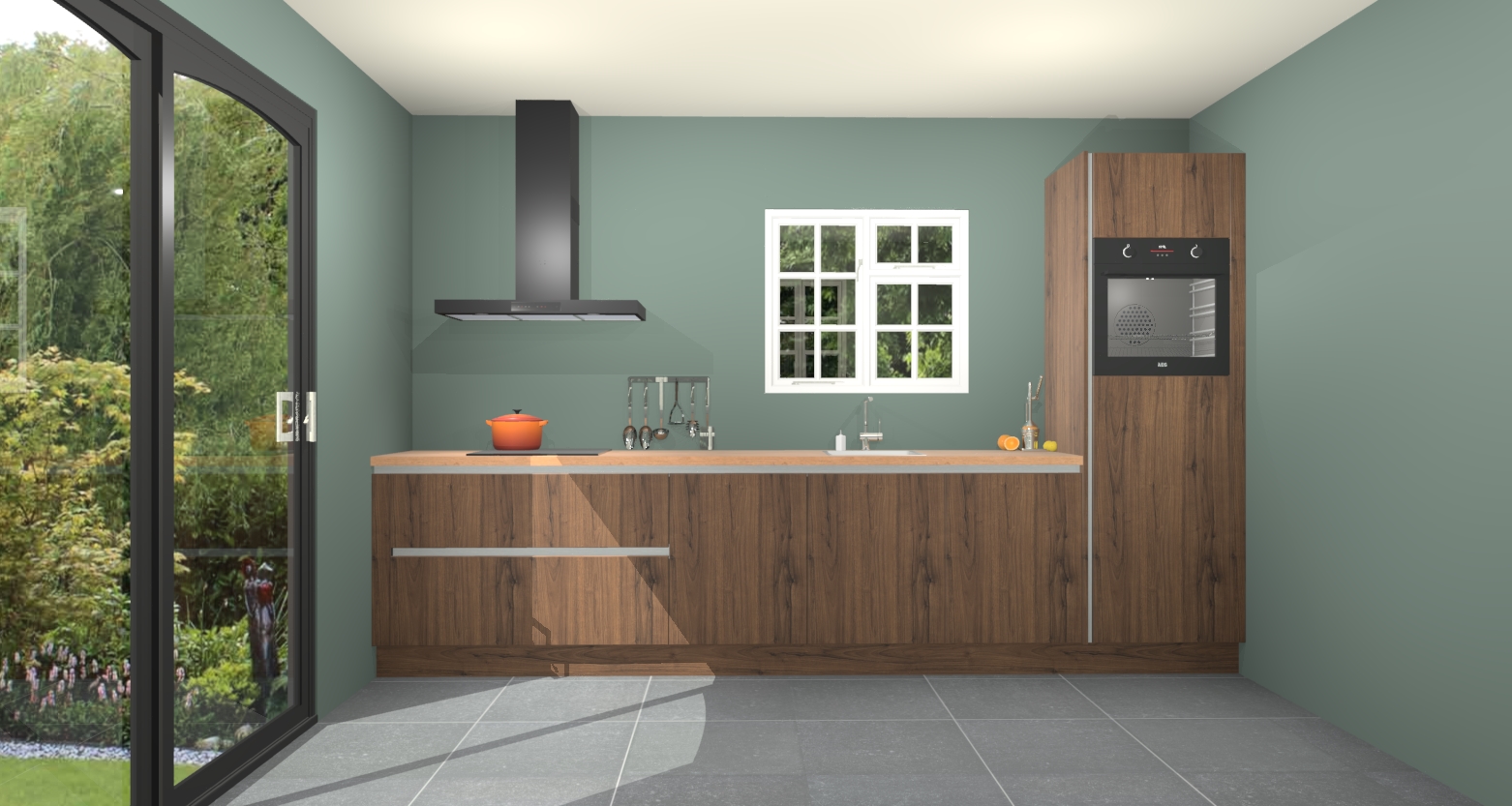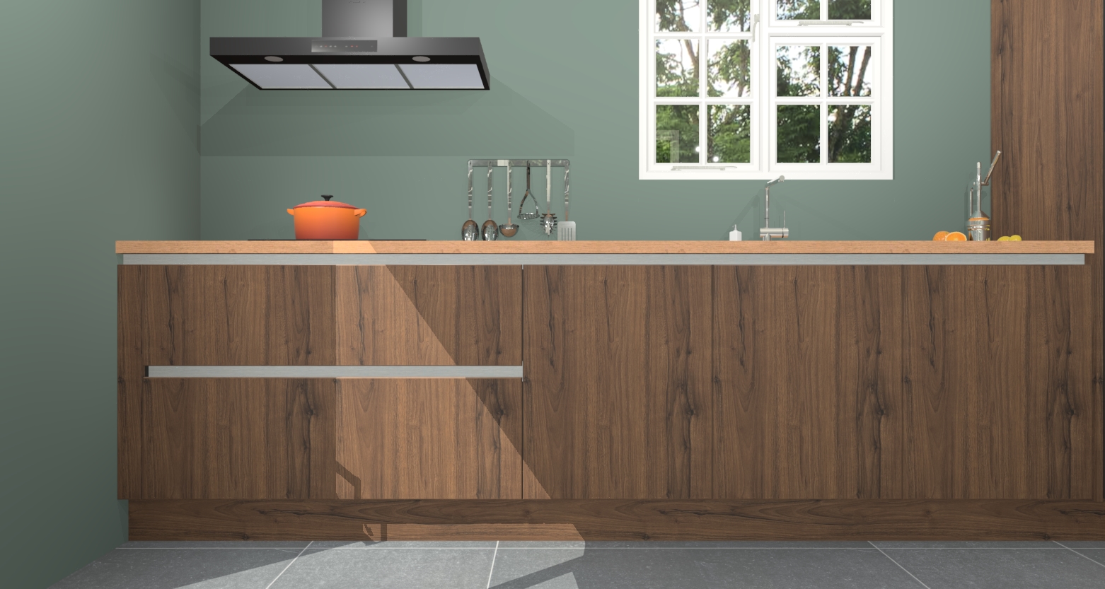 Maak kennis met de noten keuken Sofia: de perfecte mix van stijl en gemak. De keuken heeft vijf inbouw apparaten, plus een werkblad in houtlook dat meteen warmte en verfijning toevoegt.