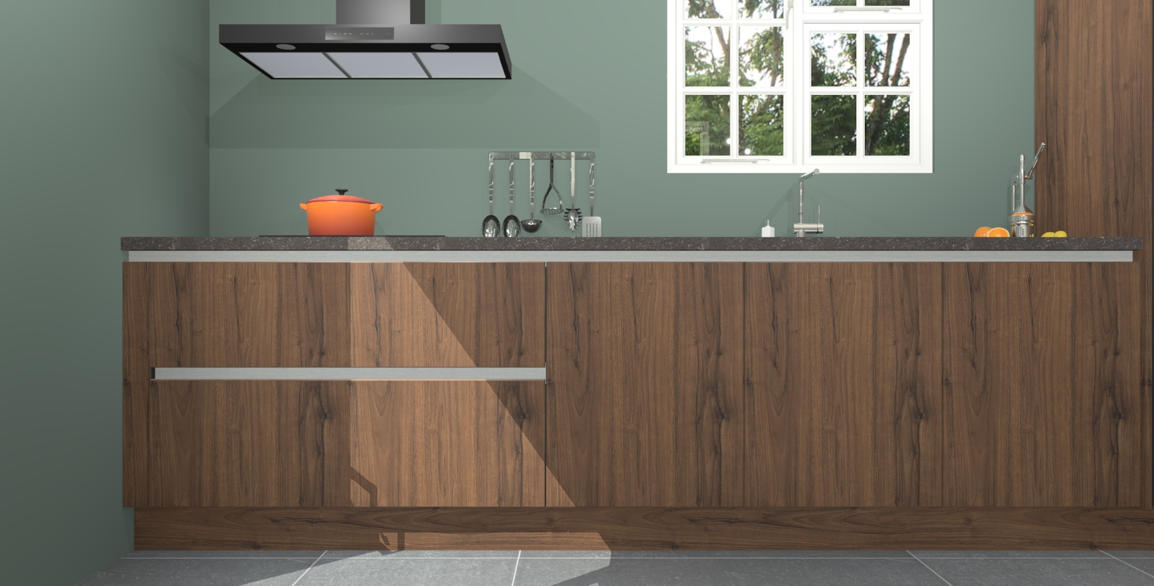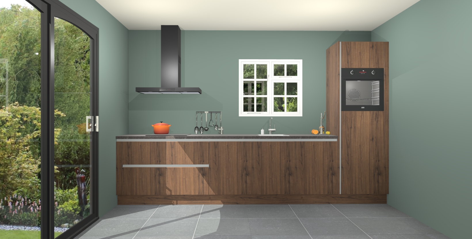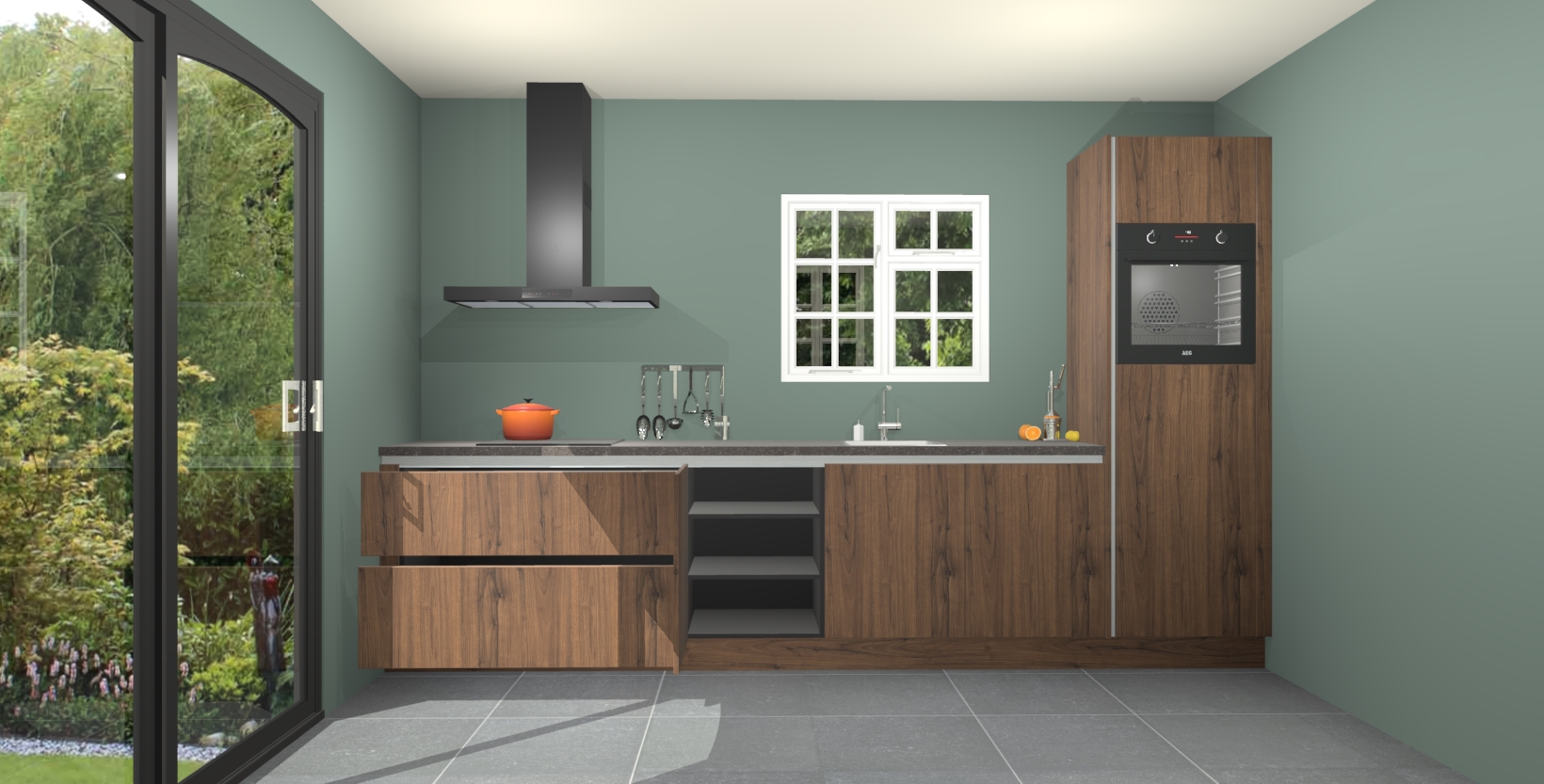 Maak kennis met de noten keuken Sofia: de perfecte mix van stijl en gemak. De keuken heeft vijf inbouw apparaten, plus een werkblad in houtlook dat meteen warmte en verfijning toevoegt.