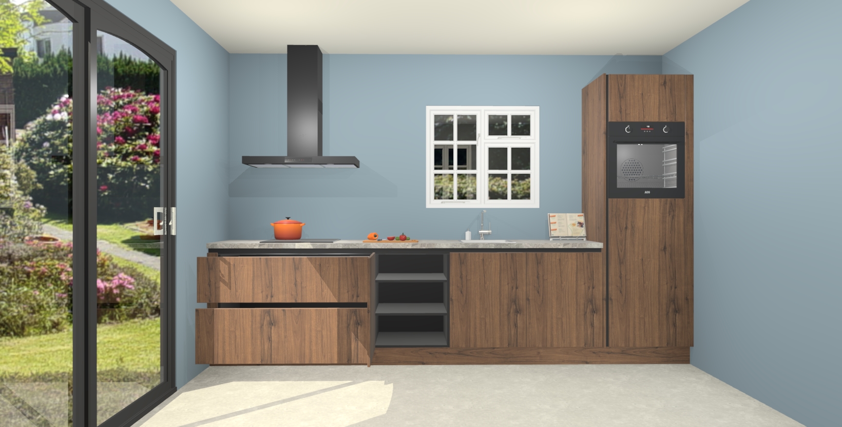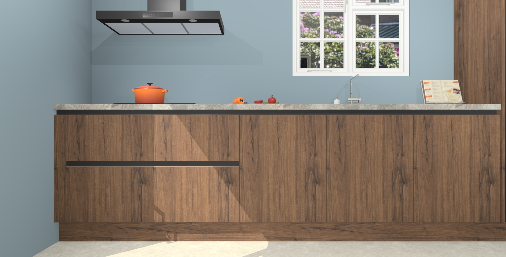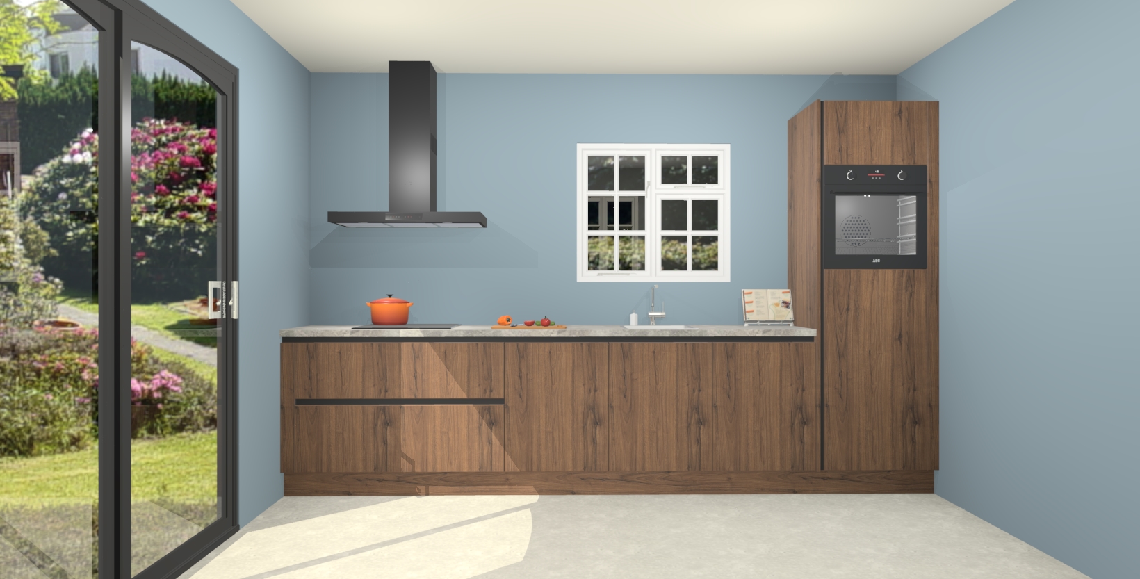 Maak kennis met de noten keuken Sofia: de perfecte mix van stijl en gemak. De keuken heeft vijf inbouw apparaten, plus een werkblad in houtlook dat meteen warmte en verfijning toevoegt.