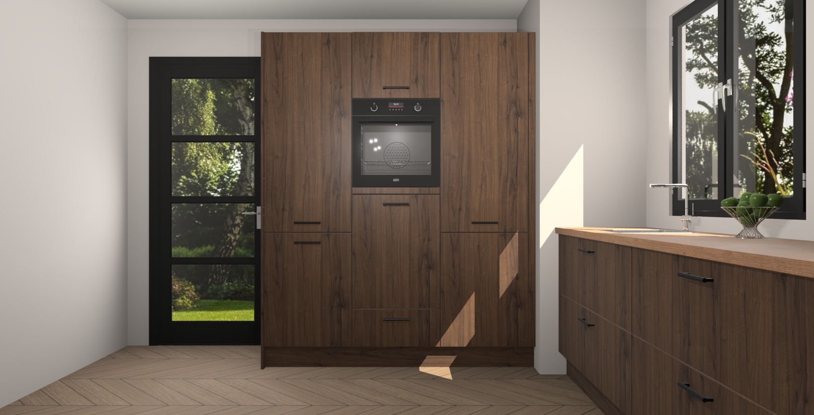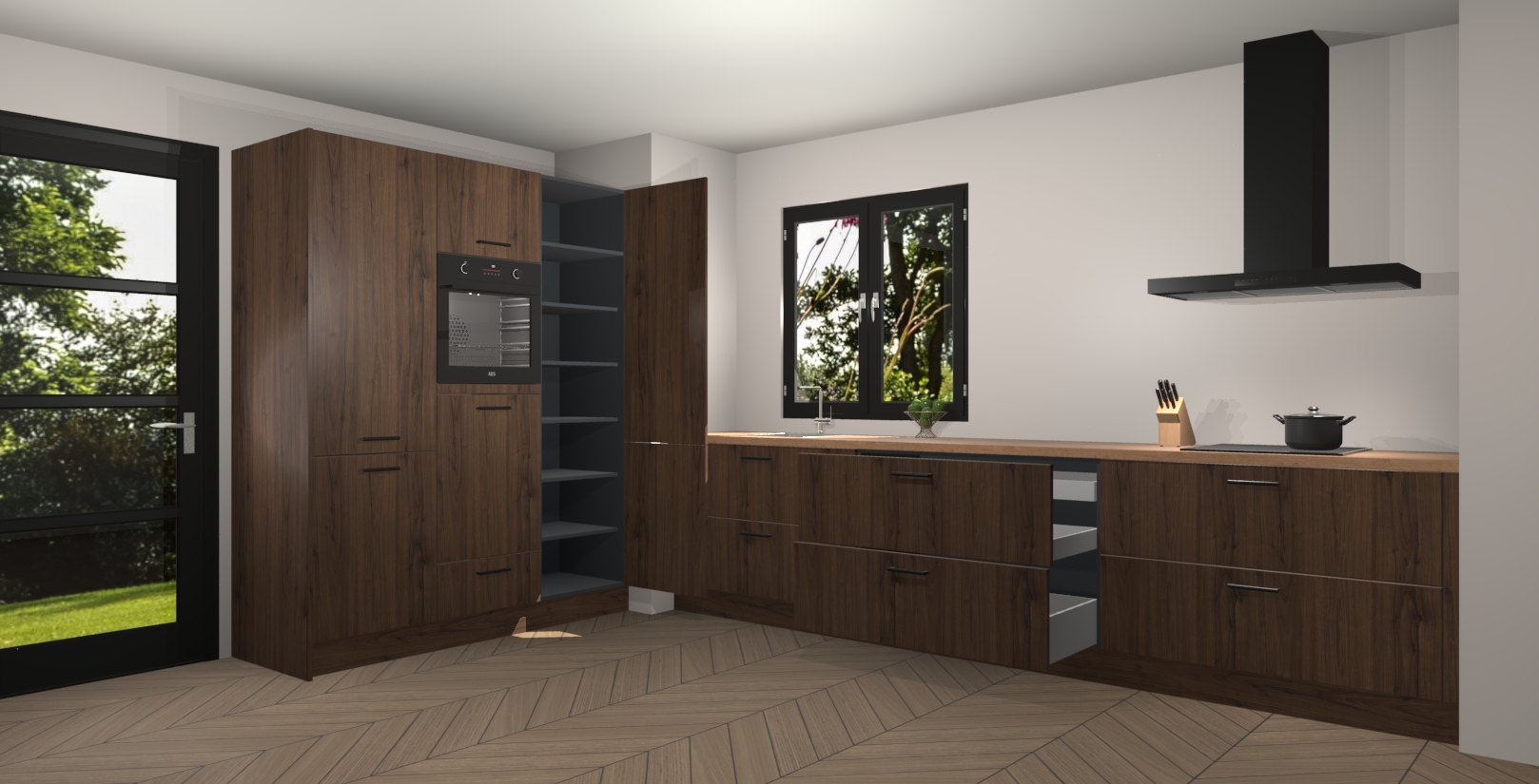 De softclose deuren openen en sluiten is ook heel eenvoudig - geniet van een moeiteloze keukenervaring, zelfs als er kinderen rondlopen. Voor extra gemak bij het plaatsen van uw bestelling bieden we ook een upgrade naar een kookplaat met geïntegreerde afzuiging.