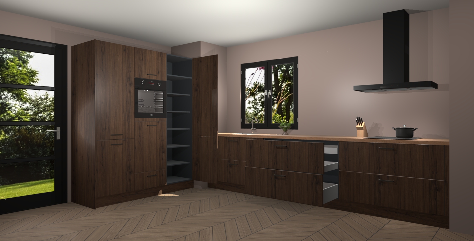 De softclose deuren openen en sluiten is ook heel eenvoudig - geniet van een moeiteloze keukenervaring, zelfs als er kinderen rondlopen. Voor extra gemak bij het plaatsen van uw bestelling bieden we ook een upgrade naar een kookplaat met geïntegreerde afzuiging.