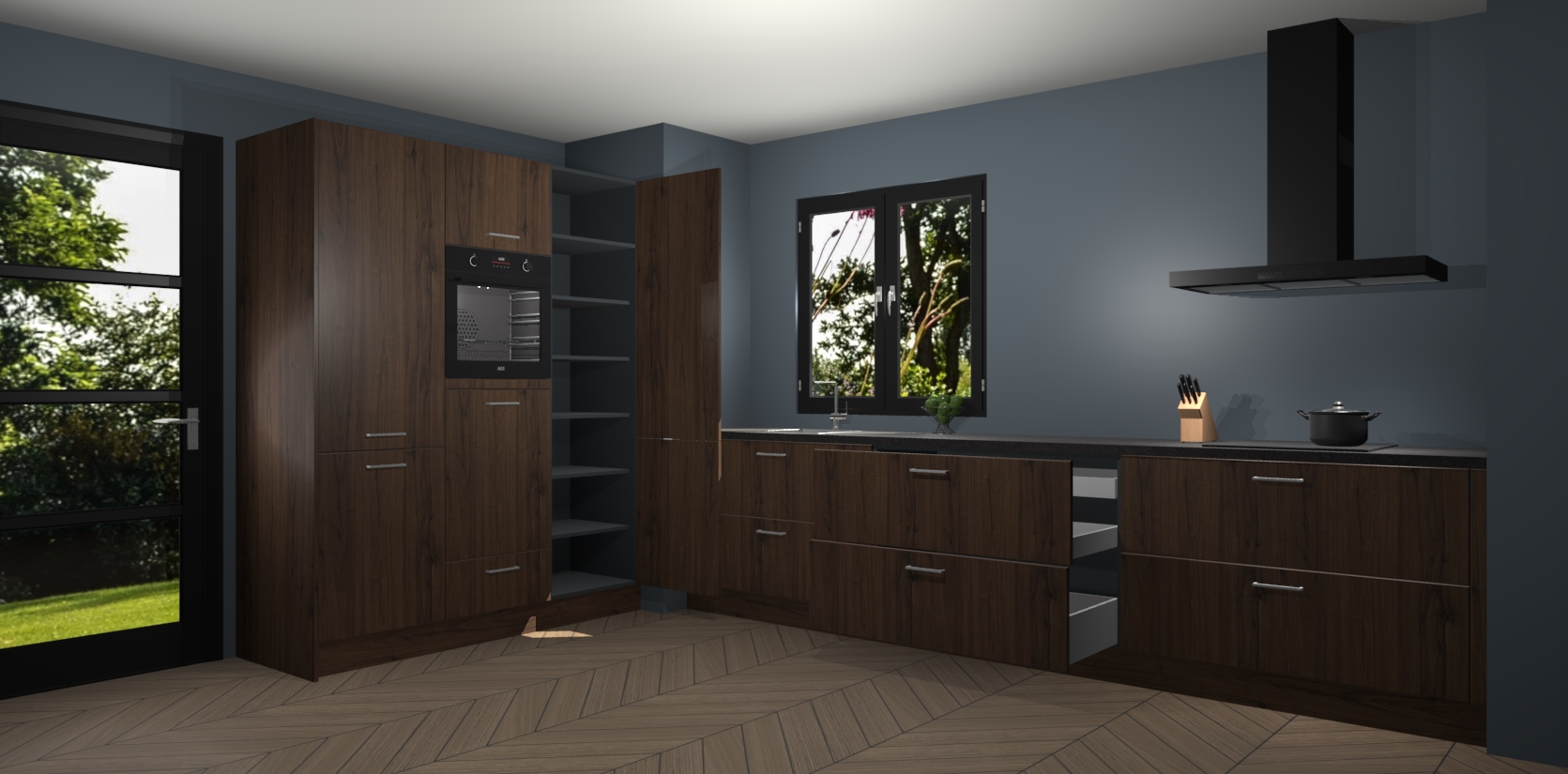 De softclose deuren openen en sluiten is ook heel eenvoudig - geniet van een moeiteloze keukenervaring, zelfs als er kinderen rondlopen. Voor extra gemak bij het plaatsen van uw bestelling bieden we ook een upgrade naar een kookplaat met geïntegreerde afzuiging.