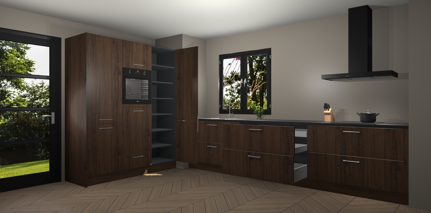 De softclose deuren openen en sluiten is ook heel eenvoudig - geniet van een moeiteloze keukenervaring, zelfs als er kinderen rondlopen. Voor extra gemak bij het plaatsen van uw bestelling bieden we ook een upgrade naar een kookplaat met geïntegreerde afzuiging.