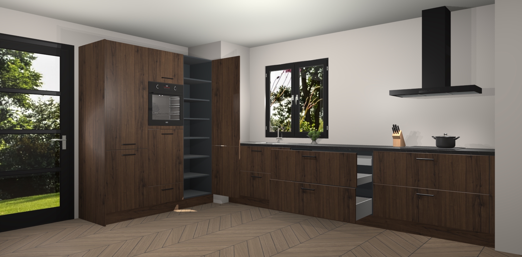 De softclose deuren openen en sluiten is ook heel eenvoudig - geniet van een moeiteloze keukenervaring, zelfs als er kinderen rondlopen. Voor extra gemak bij het plaatsen van uw bestelling bieden we ook een upgrade naar een kookplaat met geïntegreerde afzuiging.