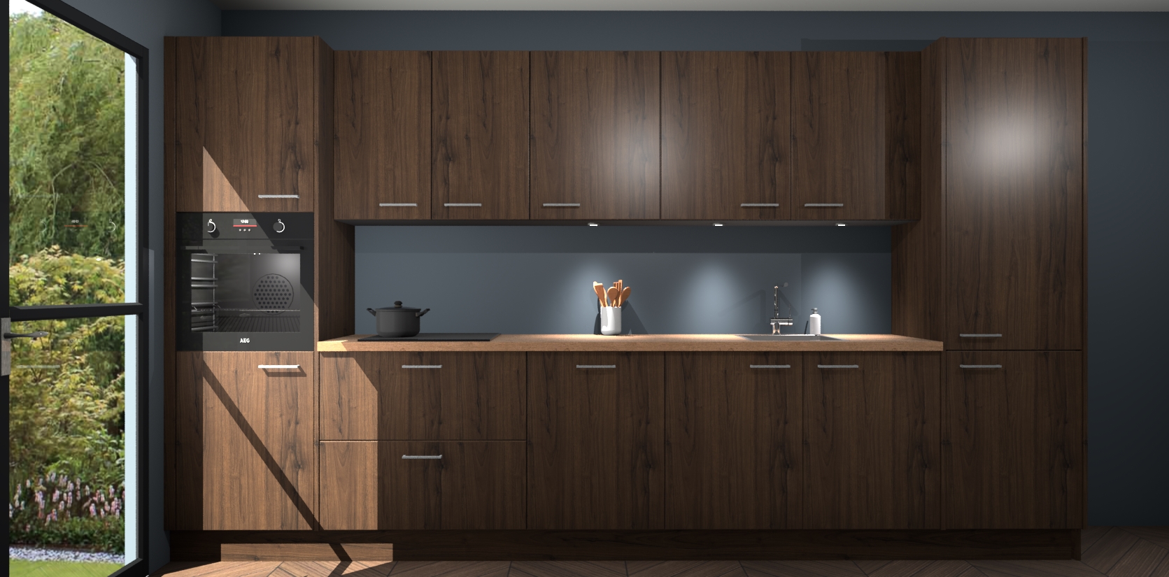 Dit is de perfecte keuken voor wie op zoek is naar een luxueuze stijl zonder zijn portemonnee te legen! Het chique ontwerp van de noten keuken Wels voegt dat vleugje verfijning toe aan elk huis. Het gemak van voorgemonteerde kasten bespaart u talloze uren tijd en energie, zodat u veel sneller dan verwacht kunt beginnen te genieten van uw prachtige nieuwe keuken. Bovendien bedraagt de levertijd slechts 7 weken.