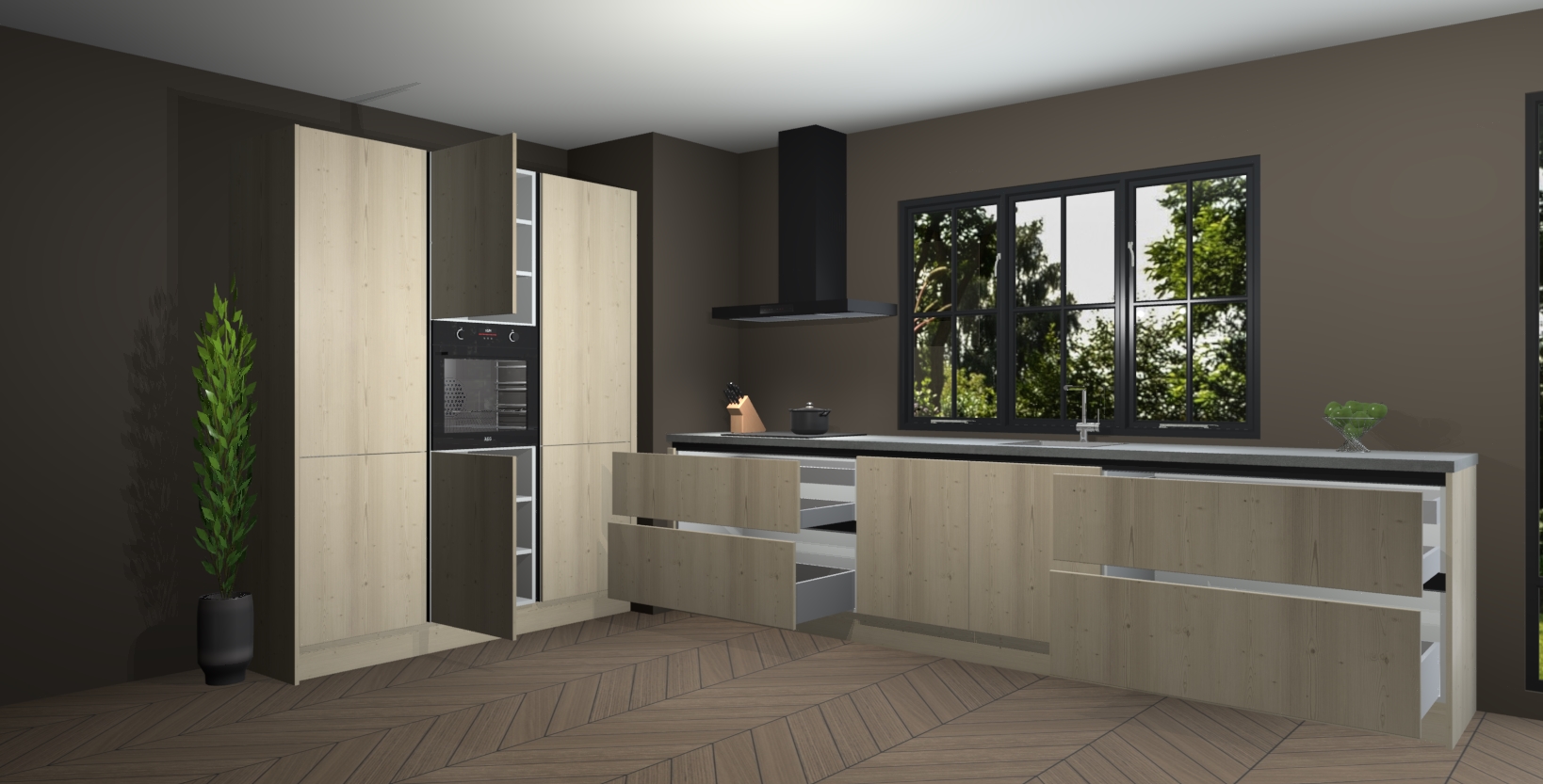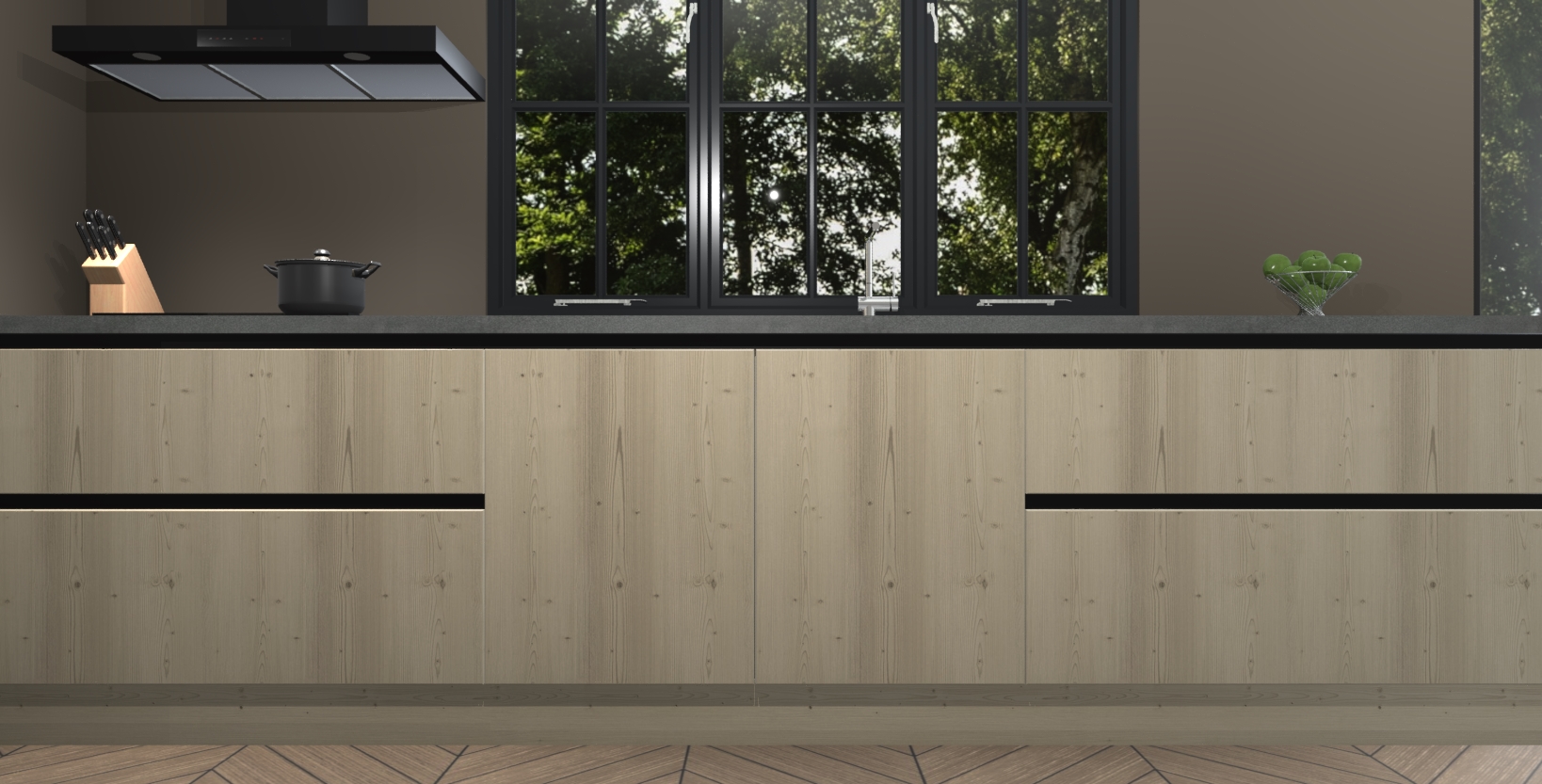 De softclose deuren openen en sluiten is ook heel eenvoudig - geniet van een moeiteloze keukenervaring, zelfs als er kinderen rondlopen. Voor extra gemak bij het plaatsen van uw bestelling bieden we ook een upgrade naar een kookplaat met geïntegreerde afzuiging.