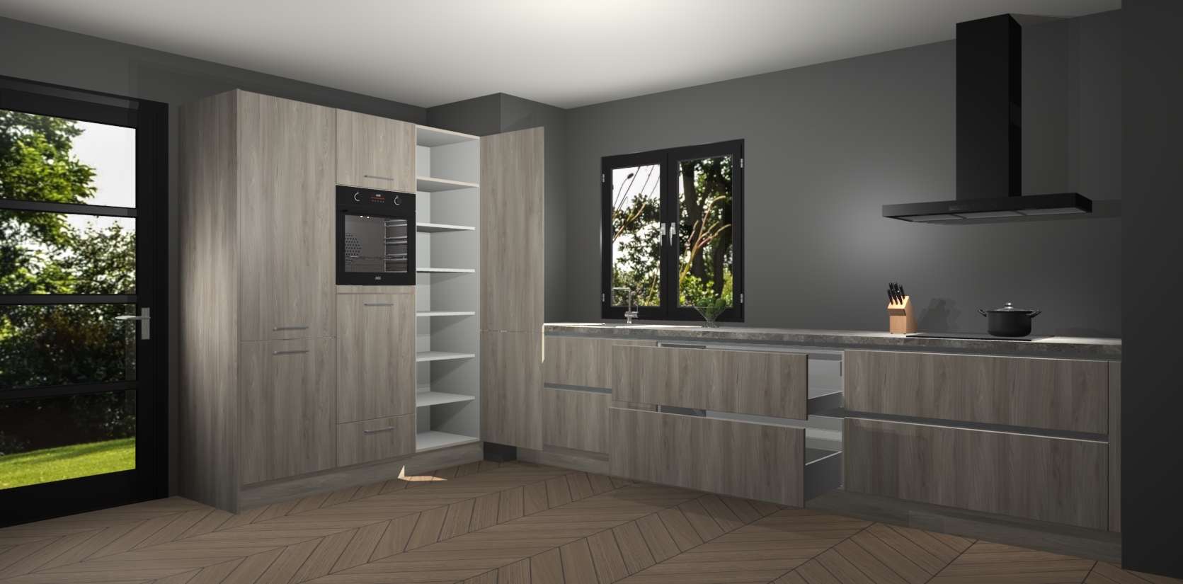 De softclose deuren openen en sluiten is ook heel eenvoudig - geniet van een moeiteloze keukenervaring, zelfs als er kinderen rondlopen. Voor extra gemak bij het plaatsen van uw bestelling bieden we ook een upgrade naar een kookplaat met geïntegreerde afzuiging.