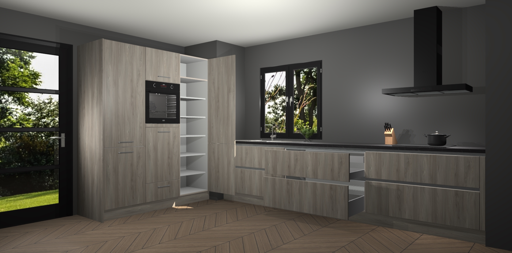 De softclose deuren openen en sluiten is ook heel eenvoudig - geniet van een moeiteloze keukenervaring, zelfs als er kinderen rondlopen. Voor extra gemak bij het plaatsen van uw bestelling bieden we ook een upgrade naar een kookplaat met geïntegreerde afzuiging.