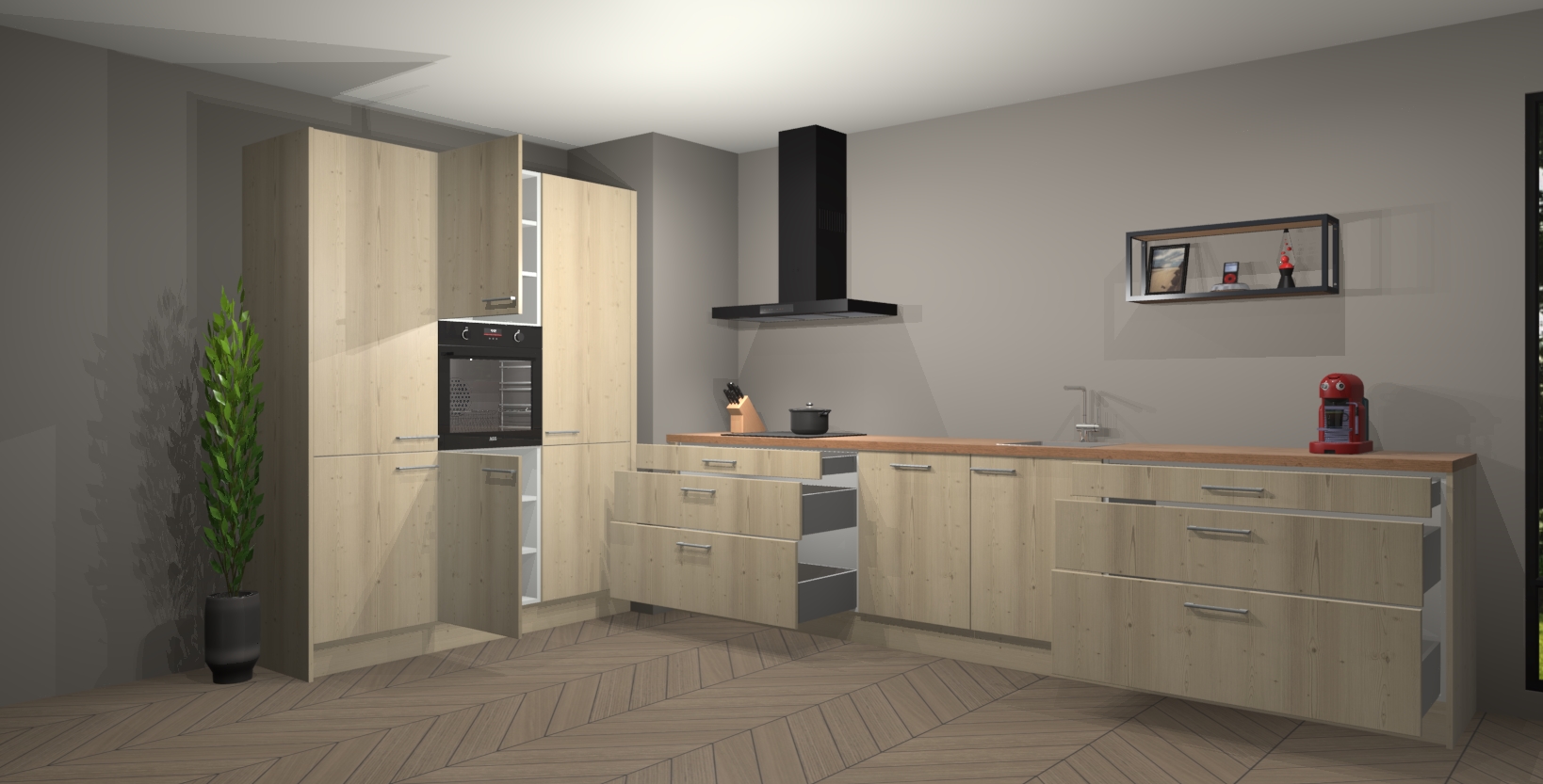 De softclose deuren openen en sluiten is ook heel eenvoudig - geniet van een moeiteloze keukenervaring, zelfs als er kinderen rondlopen. Voor extra gemak bij het plaatsen van uw bestelling bieden we ook een upgrade naar een kookplaat met geïntegreerde afzuiging.